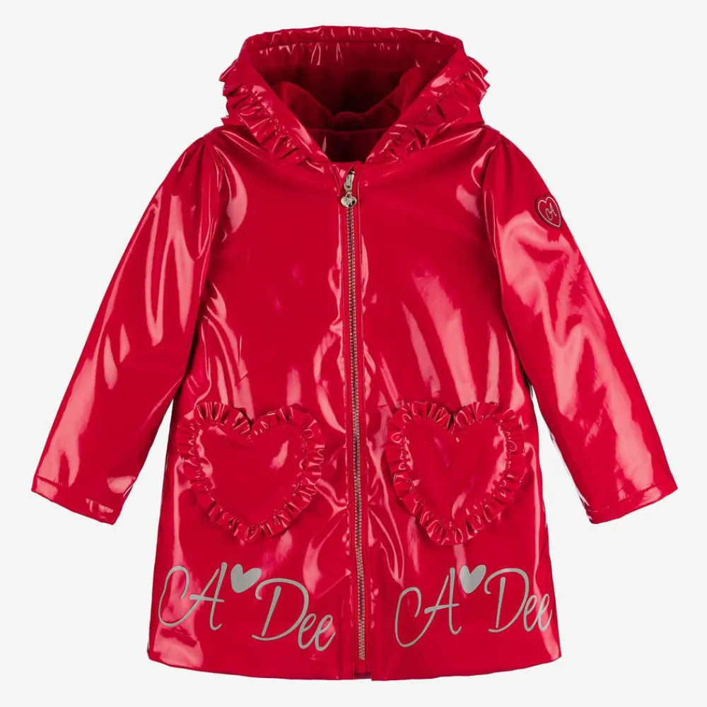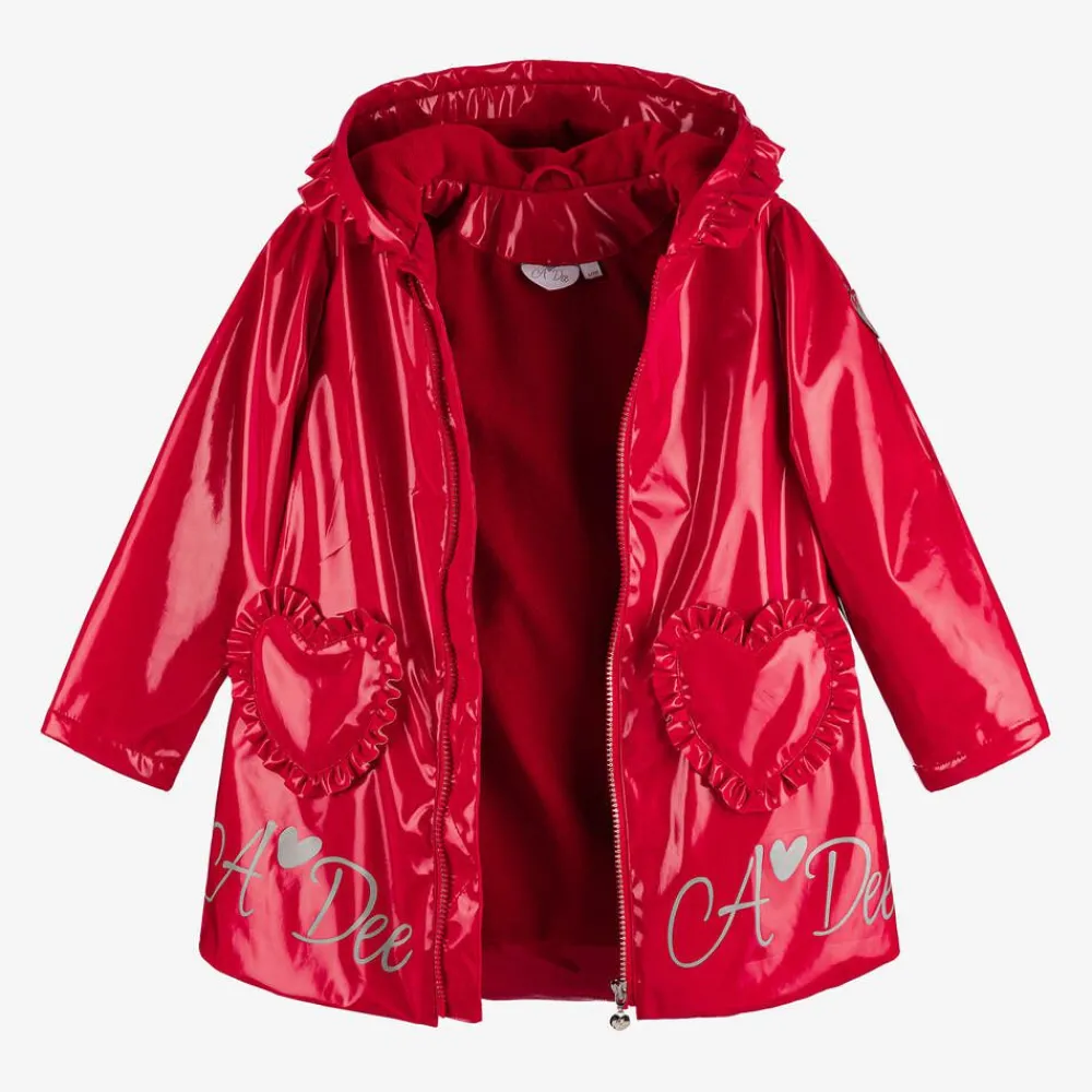 A glossy red hooded raincoat for girls by A Dee, with pretty ruffle trims. Water-resistant and cosy, it has a soft fleece lining and fleece-lined, heart-shaped pockets on the front. Reflective logo prints on the front and back, and a logo patch on one sleeve, add a stylish yet functional designer touch. The diamanté-trimmed zip has a silver-tone branded pull, and a large ruffle-trimmed heart on the back completes the look.