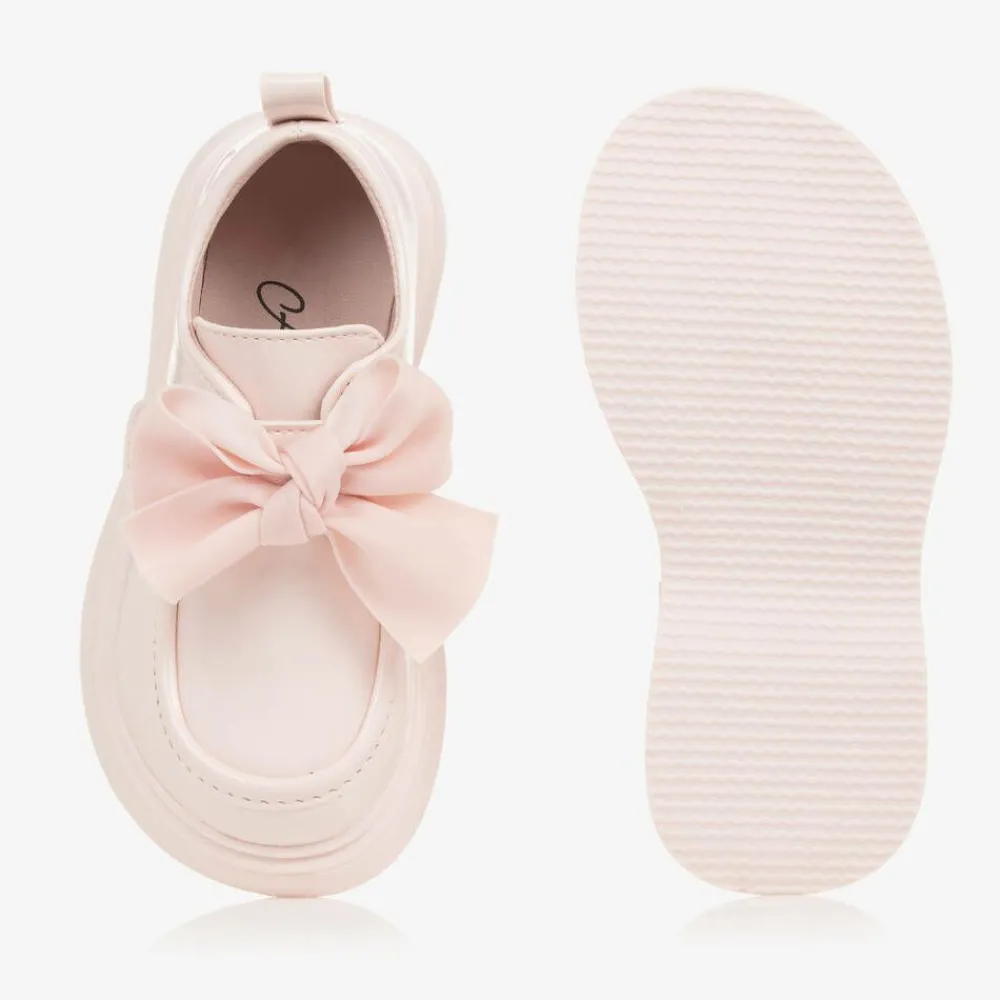 Pale pink shoes for girls by A Dee, made in patent faux leather for a glossy look. Embroidered with branding on the heel, these stylish loafer-inspired shoes have decorative bows on the velcro strap and a handy pull tab on the back to help get them on and off. They have a faux leather lining and a chunky midsole for durability and comfort. The non-slip rubber sole has a textured tread.
