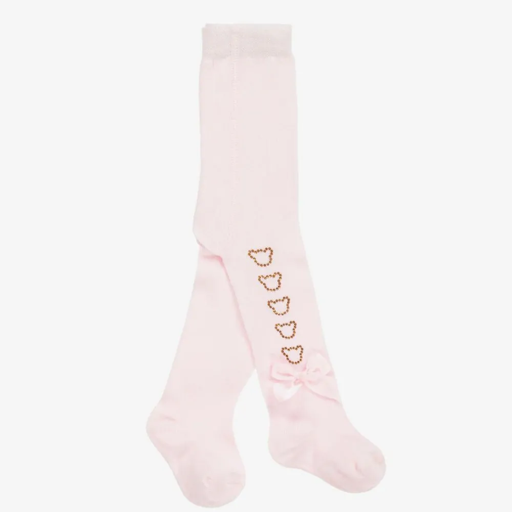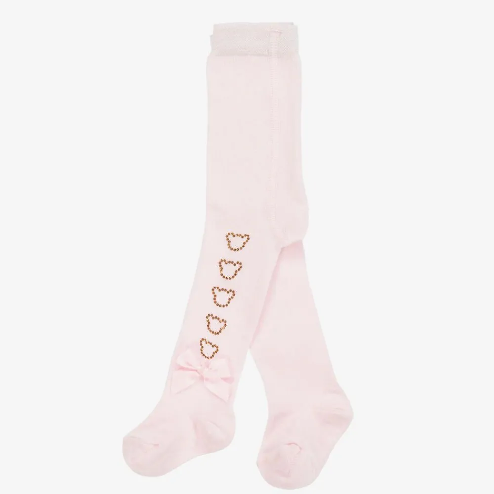 Delightful pale pink tights for baby girls from Little A by A Dee, made from a soft knit. They have gold diamanté teddy bear motifs and silky ribbon appliqué bows for a sweet look. The elasticated waist ensures a comfortable fit and there are white jacquard logos on the soles of the feet for subtle branding.