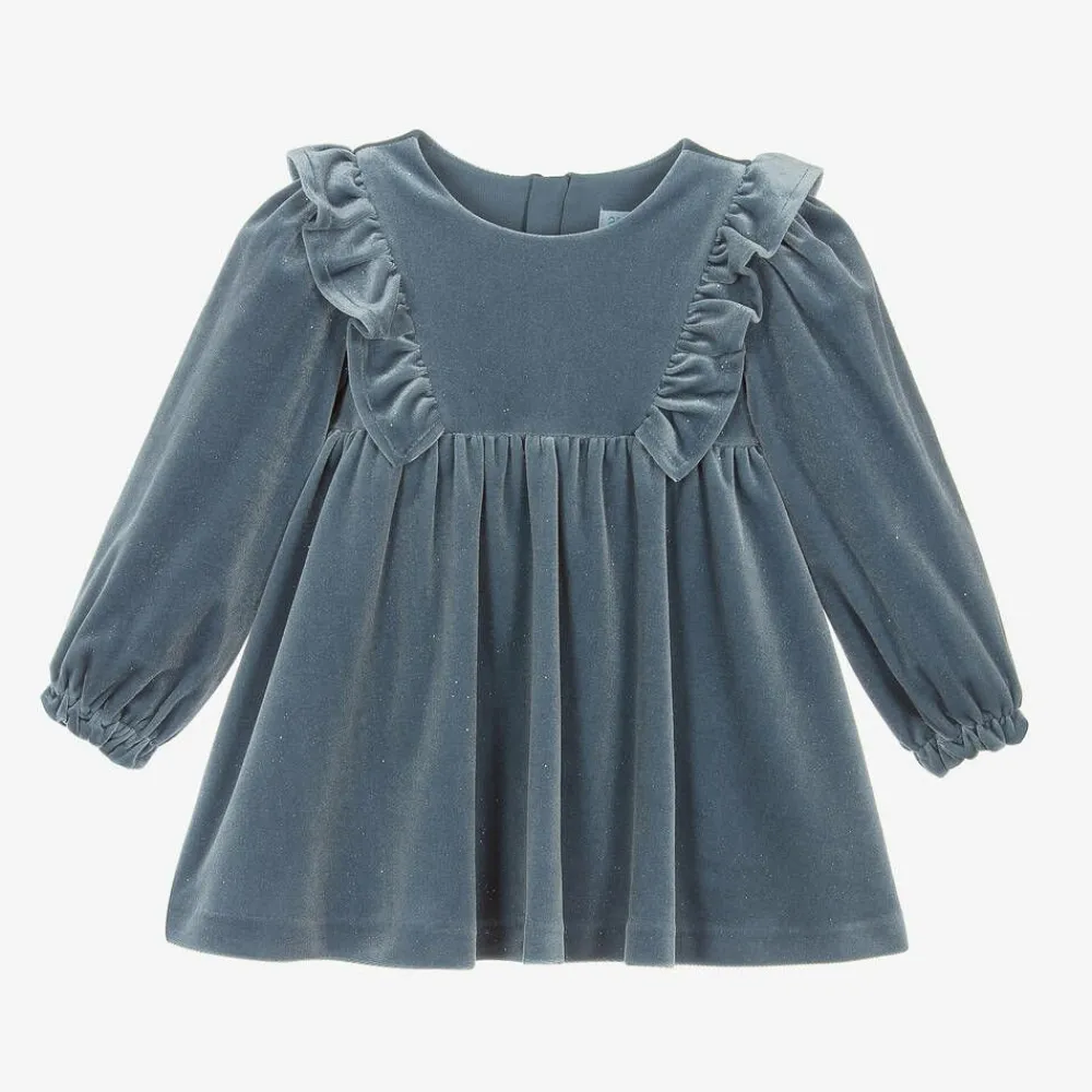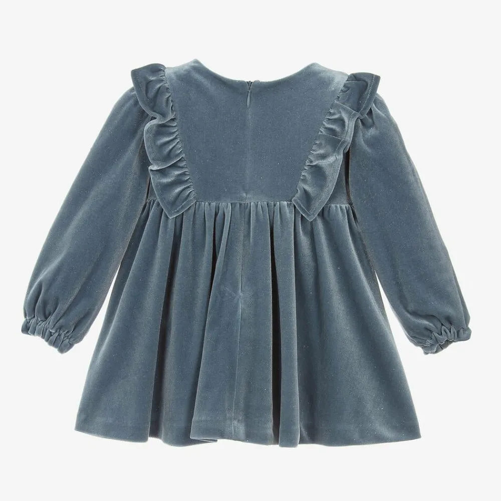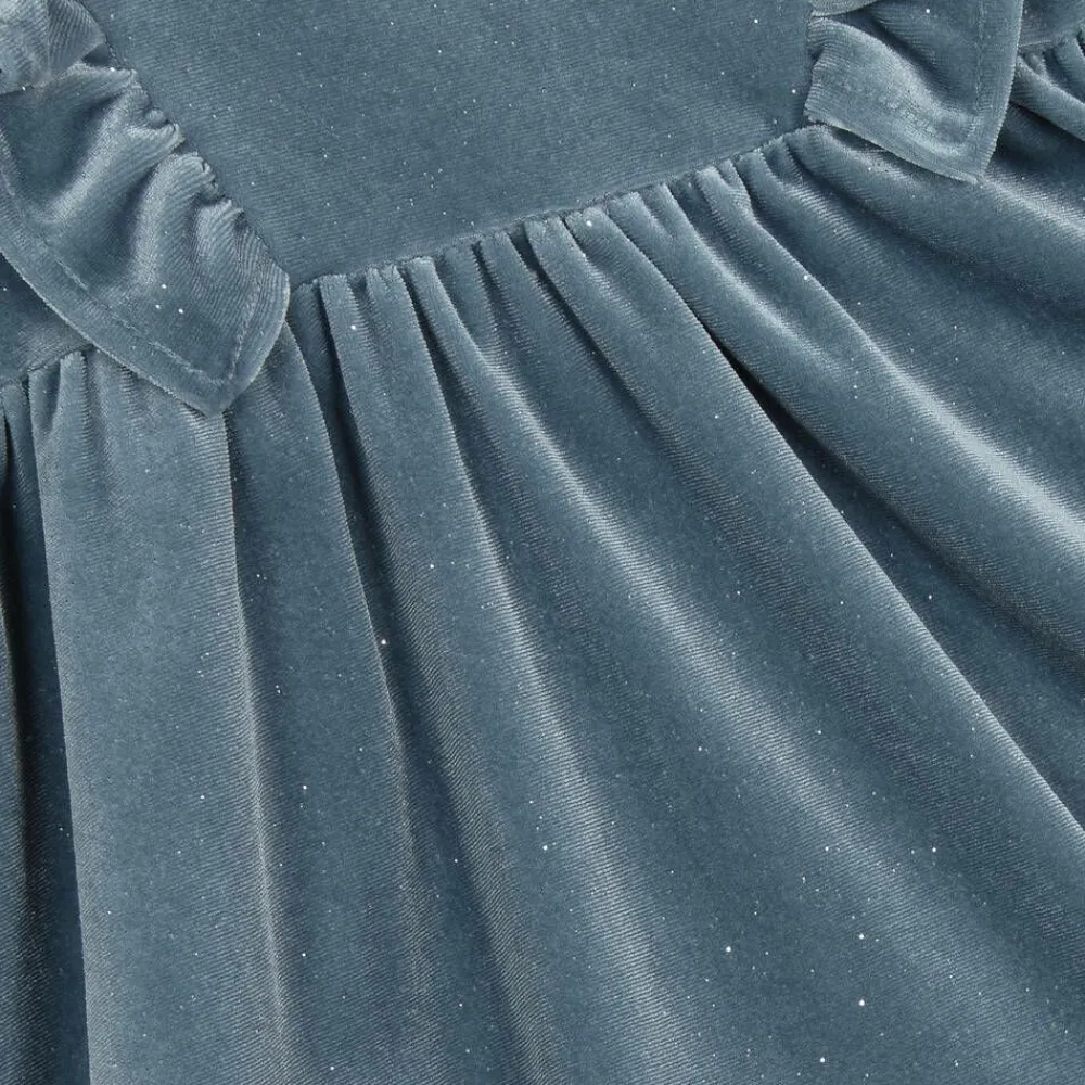 A lovely dusky blue long-sleeved dress for little girls by Abel & Lula. Made from soft velour sprinkled with silver sparkles, it has a smooth and lightweight viscose twill lining. It fastens with a concealed zip on the back and has frilled detailing over the shoulders for a lovely finish.