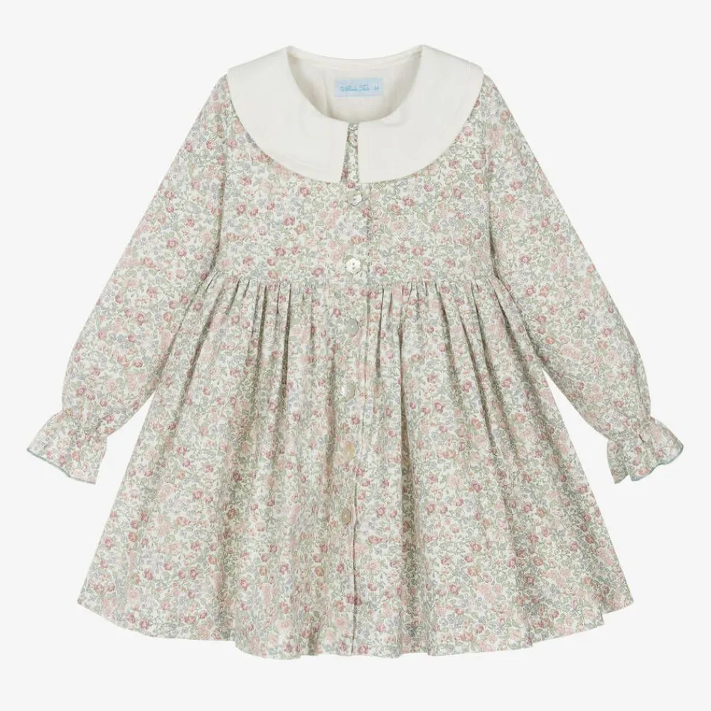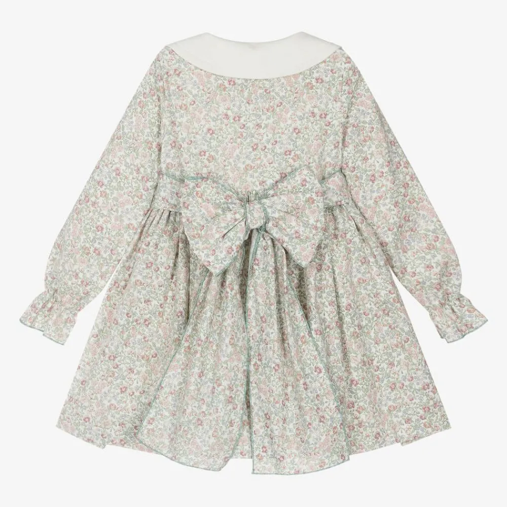 A pretty ivory dress for girls by Spanish brand Abuela Tata, beautifully patterned with pink and blue flowers on a small scale with muted green leaves. Made in soft cotton twill, this traditional style has an oversized collar with tonal seam detailing. There are flower-shaped, pearlescent buttons on the front and a lovely bow sash on the back for added charm. The dress has long sleeves with gently elasticated cuffs and a cotton-mix lining to give the skirt a fuller shape.