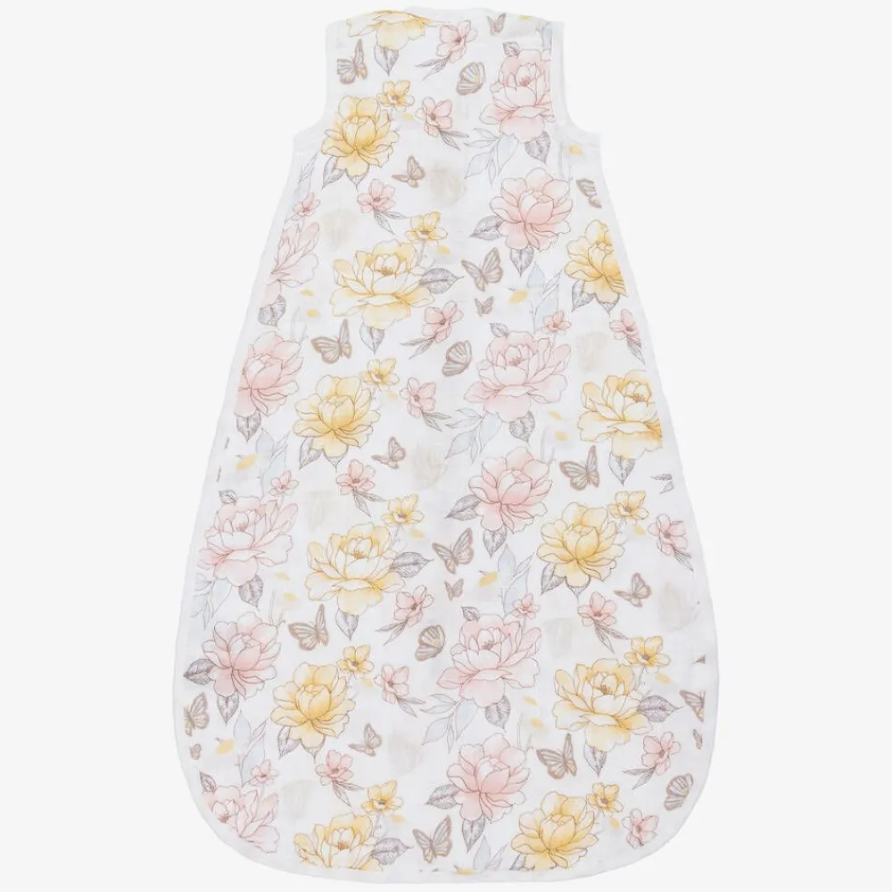 White sleeping bag for baby girls by aden + anais, made from beautifully soft organic cotton muslin. Comfortable and secure, this breathable sleeping accessory is designed in a lovely floral print in soft shades of pink, yellow and blue. It has a lightweight design with a 1.0 tog warmth rating, an fastens with an easy-to-use zip on the front.