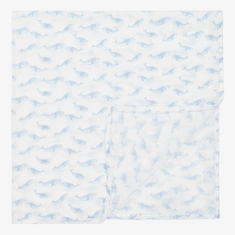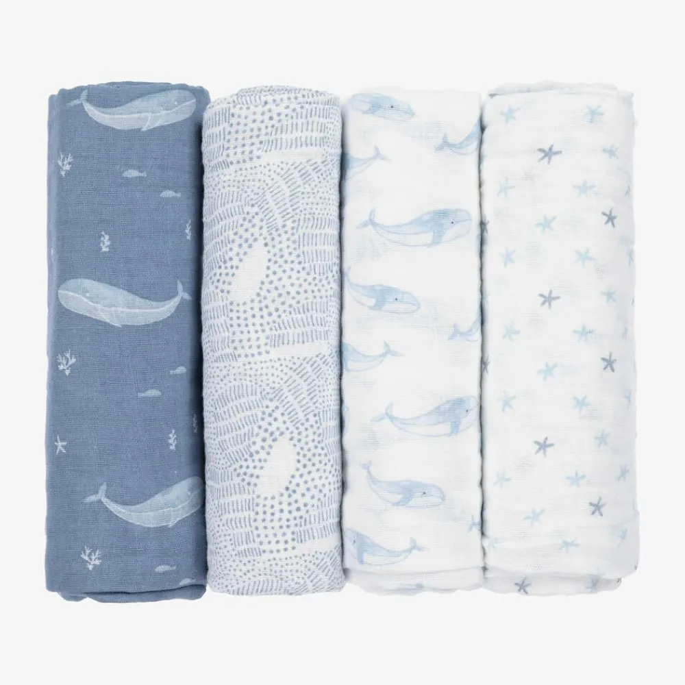 A pack of four white and blue ocean-patterned swaddles for baby boys and girls by aden + anais. Delicate against the skin, these organic cotton muslin cloths are ideal for wrapping up your baby in a comforting embrace. They are easy to wash and care for, making them great for cleaning little spills during feeding.