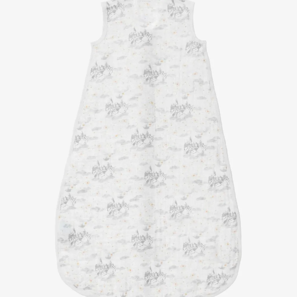 White Harry Potter cotton muslin sleep bag for baby boys and girls by aden + anais, with a playful Hogwarts print. Super soft and lightweight, with a 1.0 tog warmth rating, this comforting sleep bag fastens with a zip on the front.