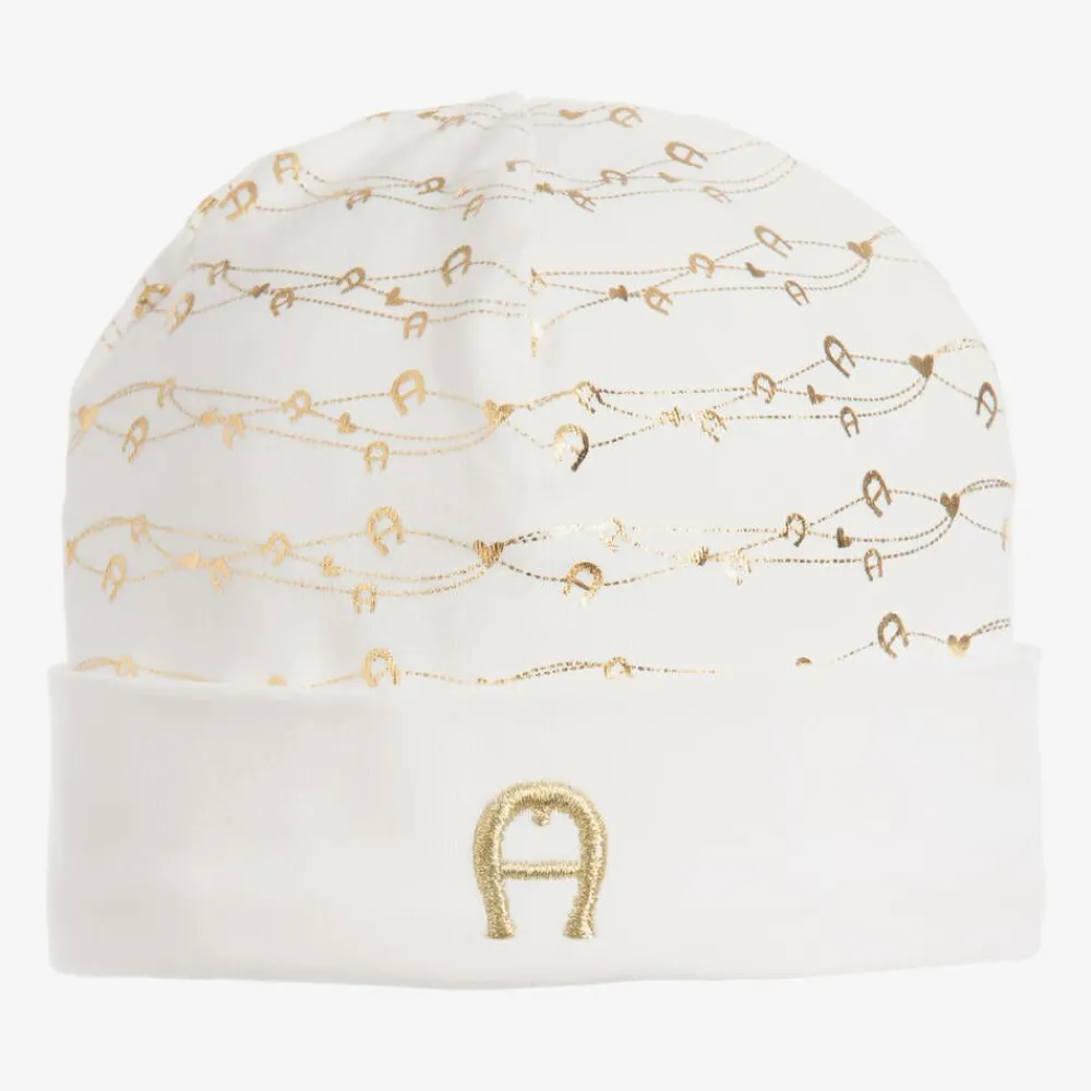 An ivory jersey hat for baby boys and girls by AIGNER. Made in soft, stretchy Pima cotton jersey, it is patterned with shiny golden logos. The brand's iconic horseshoe logo is embroidered on the turned up brim, with a small branded tab on the back.