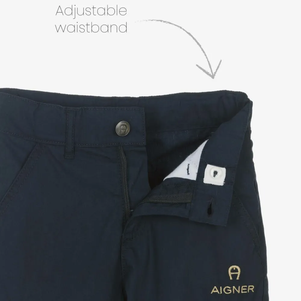 Detailed with shiny gold logos, featuring AIGNER's signature 'A' horseshoe motif, a white and navy blue cotton shorts set for boys. The soft jersey polo shirt fastens with buttons at the neck and has a logo patch on one sleeve. It pairs with Bermuda-length cargo shorts. Soft and lightweight, they fasten with a zip and button and have a comfortable, adjustable waistband.