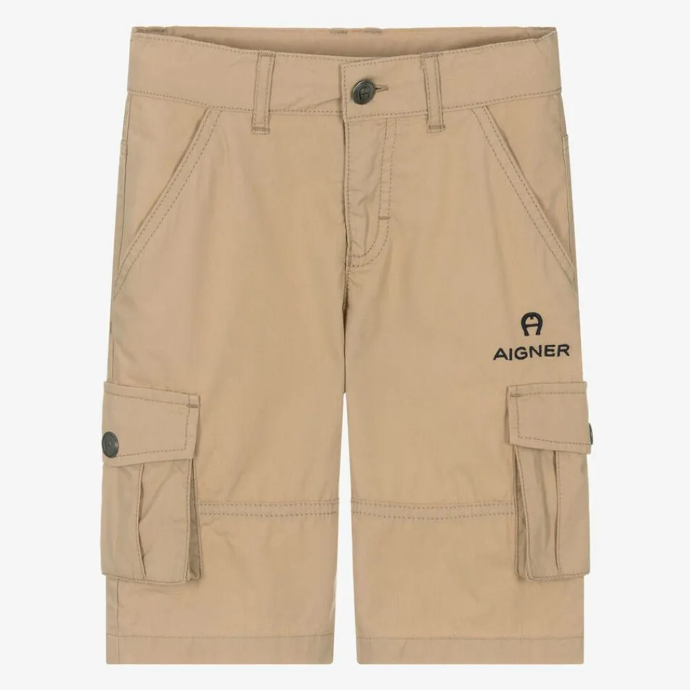 Beige cotton cargo shorts for boys by AIGNER, in a longer length Bermuda style. Soft, lightweight and comfortable, the waistband is adjustable and they fasten with a zip and button. The practical design is detailed with slanted front pockets, faux back pockets and popper cargo pockets on each leg. An embroidered navy blue logo, featuring the signature 'A' horseshoe motif, completes the look.