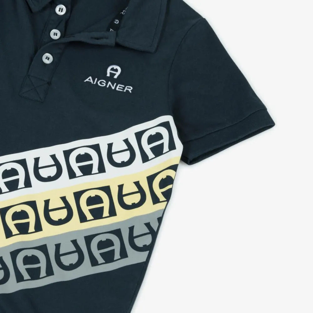 Navy blue polo shirt for boys by AIGNER, made in soft cotton jersey, with a pointed collar and branded button fastenings on the front. Comfortable and easy wearing, it has white, yellow and grey stripes on the front patterned with the brand's signature 'A' horseshoe logo and a matching embroidered logo in white on the chest.
