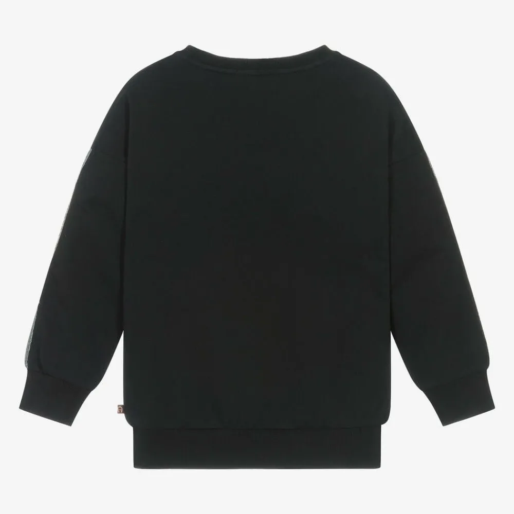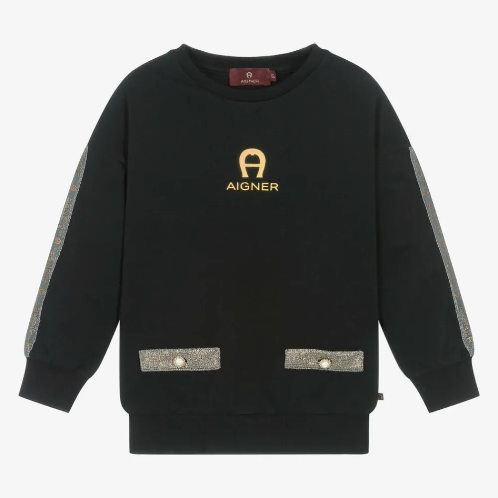 Black cotton sweatshirt for girls by AIGNER, made in soft and comfortable jersey. This casual wardrobe staple is elevated by glittery gold faux pocket trims decorated with shiny gold metal and pearl buttons. A relaxed, dropped shoulder fit, it has glittery, sheer logo tape on the long sleeves and a gold logo print on the chest featuring the signature 'A' horseshoe motif.