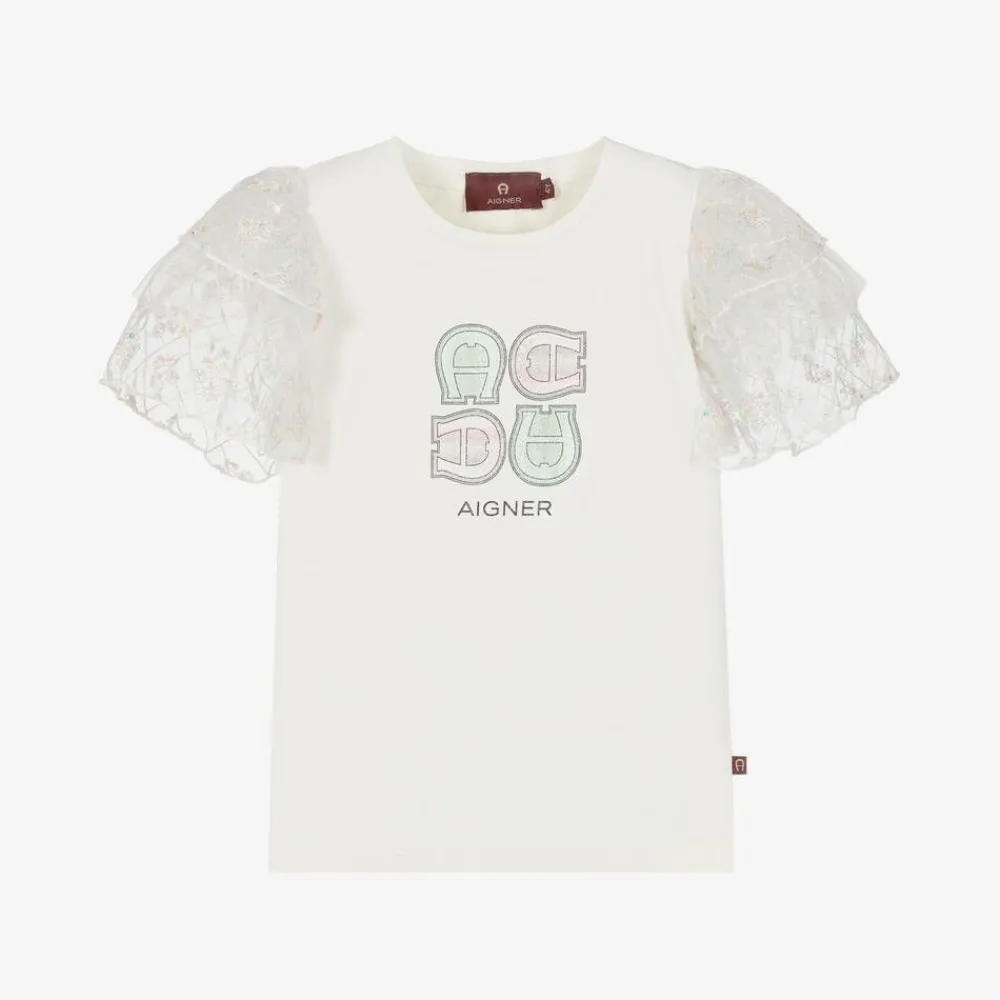 A stylish ivory T-shirt for girls by AIGNER, with layered tulle sleeves, beautifully embroidered and stitched with sequins. Made in comfortable cotton jersey, it has a glittery pink and green logo design on the front, featuring the signature 'A' horseshoe motif.