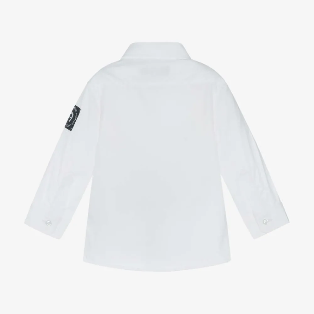 A white cotton poplin shirt for baby boys from AIGNER. Soft and lightweight, it fastens with branded buttons on the front and cuffs. For instant designer appeal, this smart shirt features a beige signature 'A' horseshoe logo print, with a branded patch on one sleeve.