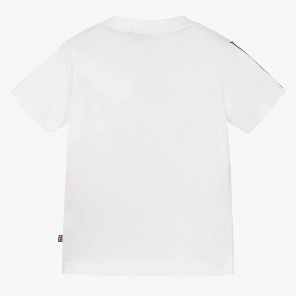 Comfortable white, red and navy blue cotton jersey T-shirt for baby boys by AIGNER, with useful poppers on one shoulder for speedy dressing. It has the signature 'A' horseshoe logo printed on the front in navy blue, and logo taping on the sleeves.