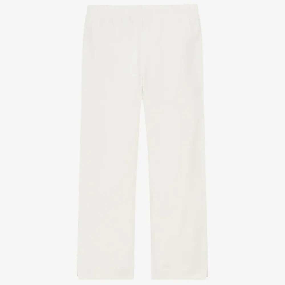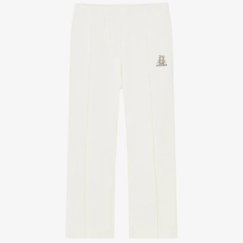 Casual ivory joggers for girls by AIGNER, made in soft cotton jersey. This pull-on style is styled with front seams on the straight legs and on-seam pockets. A cute, glittery teddy bear and logo motif are printed on one side.