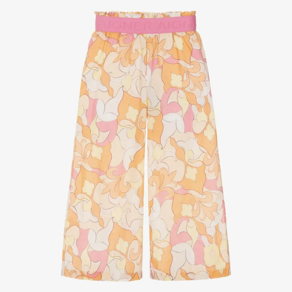 Fabulous summery trousers for girls by AIGNER, with an ornate pattern in pink and pale orange. Soft, comfortable and lightweight, they are made in cotton poplin with a half-lining. They have a pink, elasticated waistband with repeat, jacquard logos and a frilled trim. Easy to wear, they simply pull up.