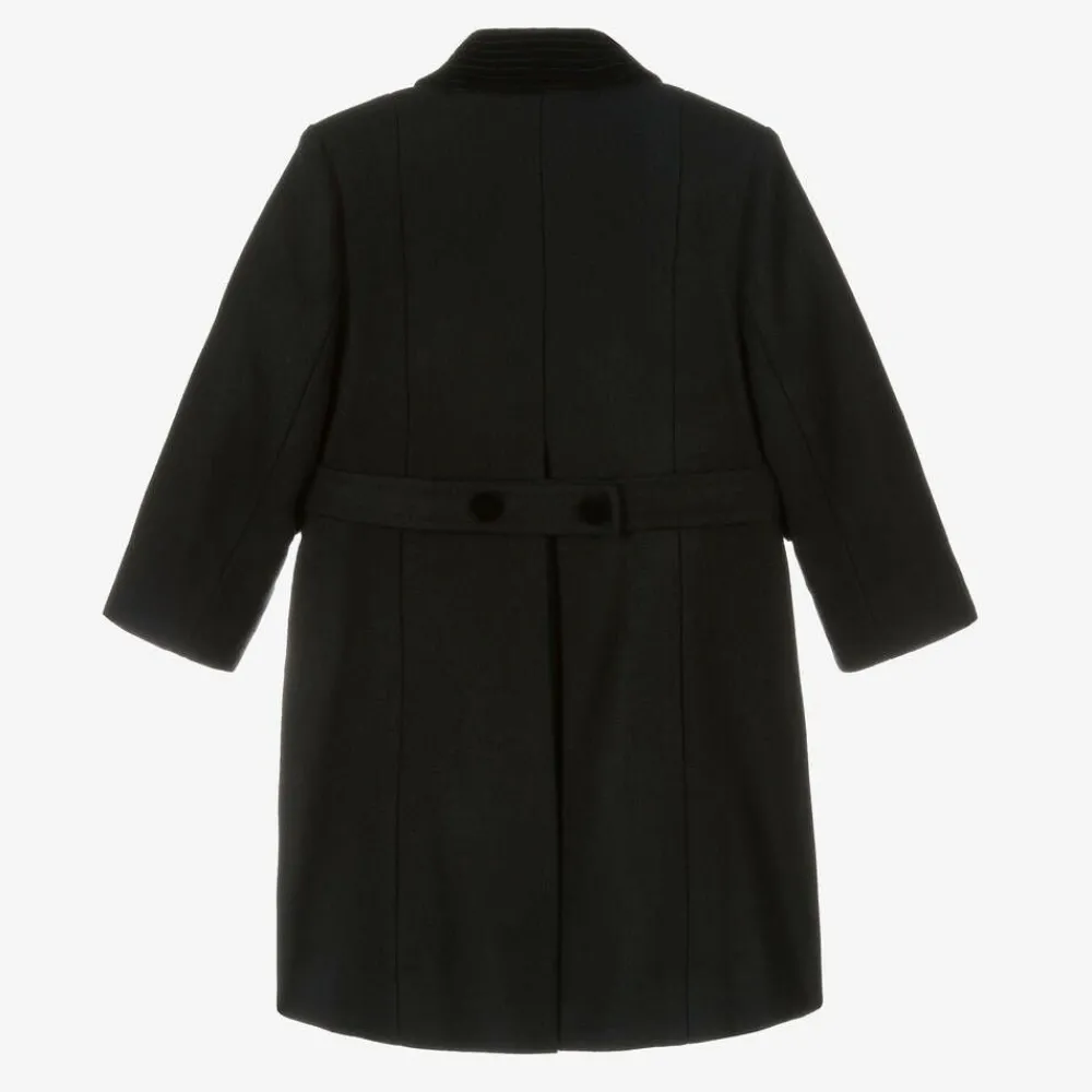 Classic black coat for boys and girls by Ancar, made in luxurious wool. A traditional, heritage style, this double-breasted coat has smart velvet trim on the collar and pocket flaps, with matching covered buttons. On the back, it has an inverted pleat and a half-belt detail with decorative buttons. The look is complete with a silky satin lining.