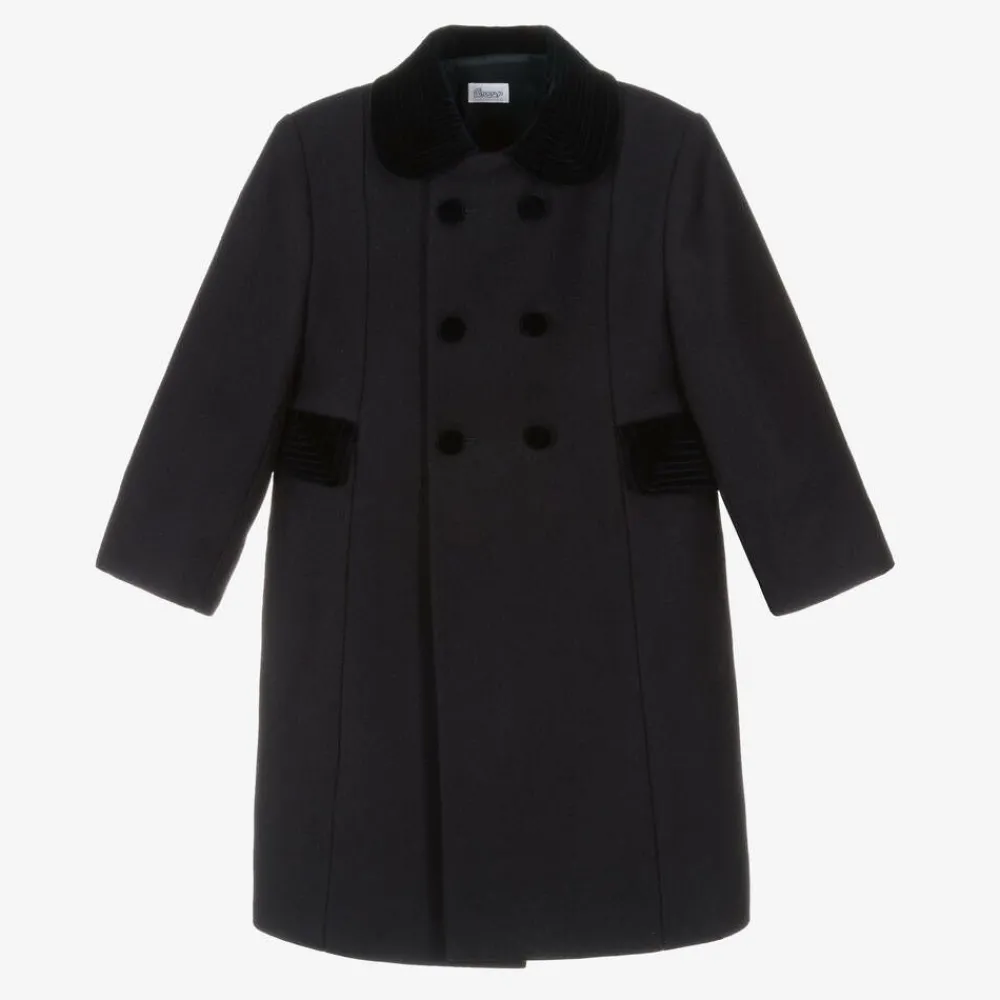 Classic navy blue coat for boys and girls by Ancar, made in luxurious wool. A traditional, heritage style, this double-breasted coat has smart velvet trim on the collar and pocket flaps, with matching covered buttons. On the back, it has an inverted pleat and a half-belt detail with decorative buttons. The look is complete with a silky satin lining.