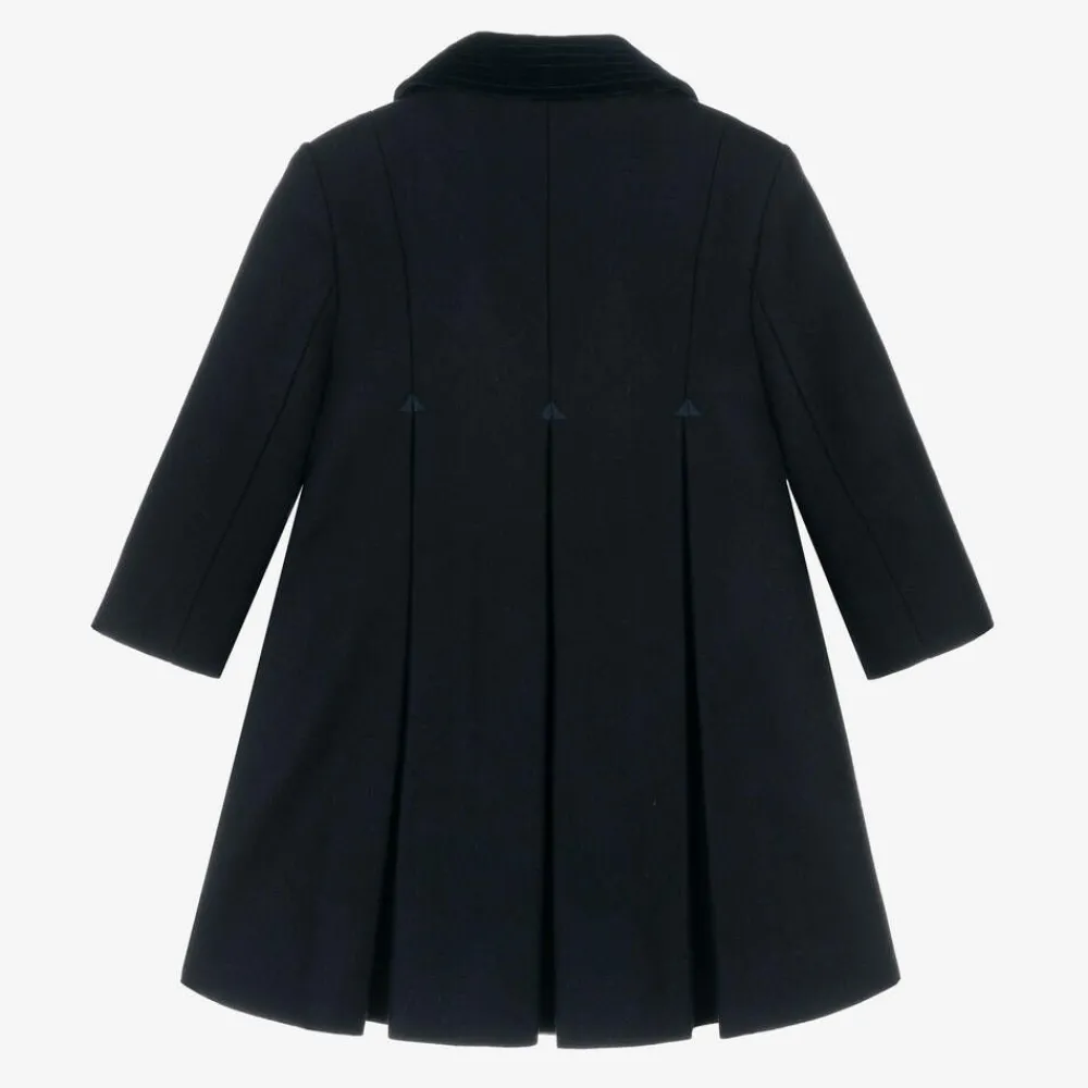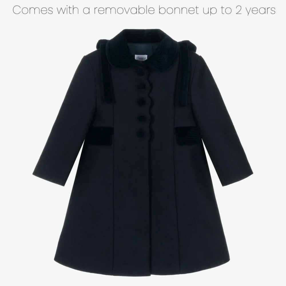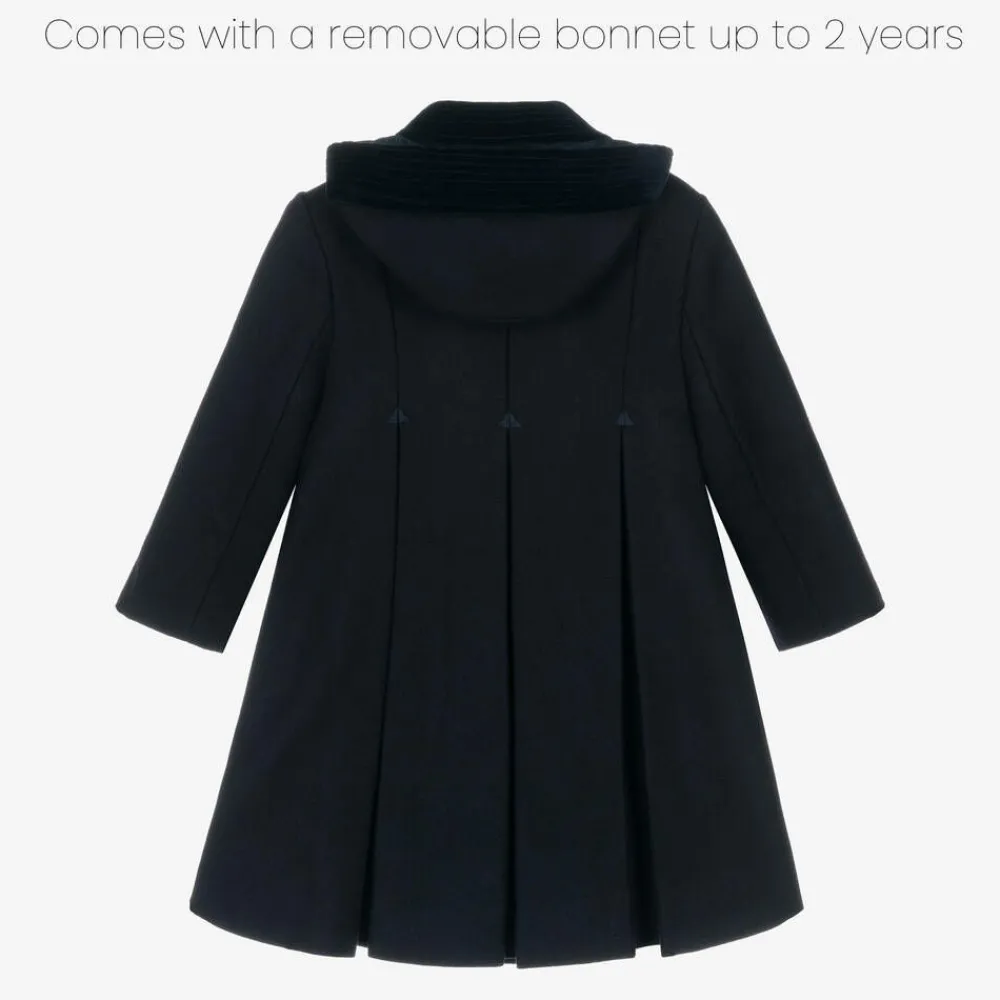 Classic navy blue coat for girls from Spanish brand Ancar, made in luxurious wool. For a traditional heritage look, it has a stitched velvet collar and pocket flaps, with matching covered buttons and scalloped trim. It is designed with smart inverted pleats on the back for ease of movement and has a beautiful tonal satin lining. Smaller sizes come with a matching bonnet, which neatly attaches to the coat.
