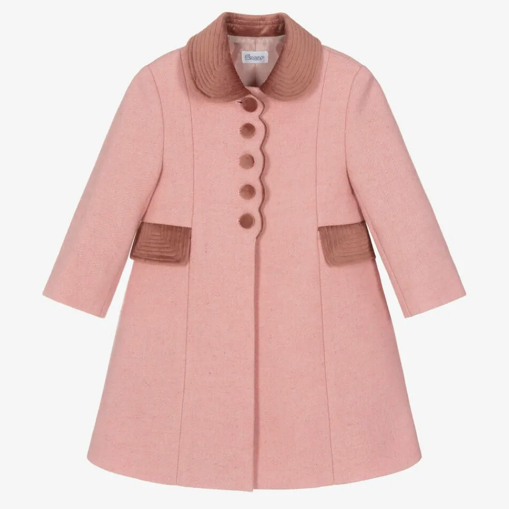 Classic pink coat for girls from Spanish brand Ancar, made in luxurious wool. For a traditional heritage look, it has a stitched velvet collar and pocket flaps, with matching covered buttons and scalloped trim. It is designed with smart inverted pleats on the back for ease of movement and has a beautiful tonal satin lining. Smaller sizes come with a matching bonnet, which neatly attaches to the coat.