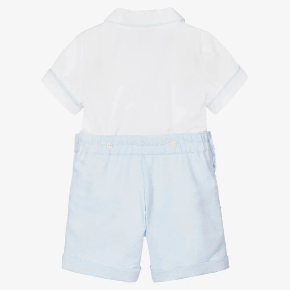 Little boys blue and white cotton shorts set by Ancar, made exclusively for Childrensalon. Traditionally styled, the lightweight shirt has a Peter Pan collar, blue trims and mother-of-pearl buttons on the front. The coordinating shorts have a lightweight lining, turn up hems and are partly elasticated at the waist for comfort. Both pieces button together for a neat and tidy look.