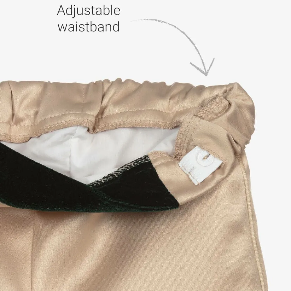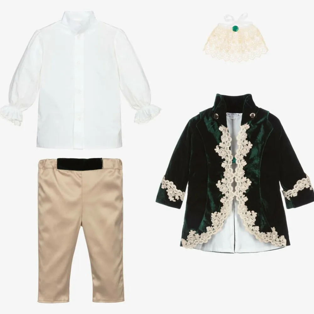 Ideal for special occasions, this emerald green velvet and satin suit for little boys is by Andreeatex. Lined for comfort, the long-line jacket has a luxurious feel with ornate, gold embroidered trim and shiny gold buttons on the stand-up collar. The white, puffed-sleeve, collarless shirt has a traditional lace ruffle, which sits underneath the neckline with a large emerald green gem and attaches with buttons. The gold satin trousers have a part-elasticated waist for comfort and tie the look together beautifully with the green velvet trim on the front. This exquisite set comes with a matching green velvet hat with statement feather detail.