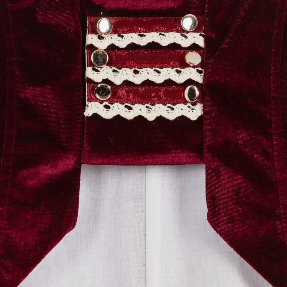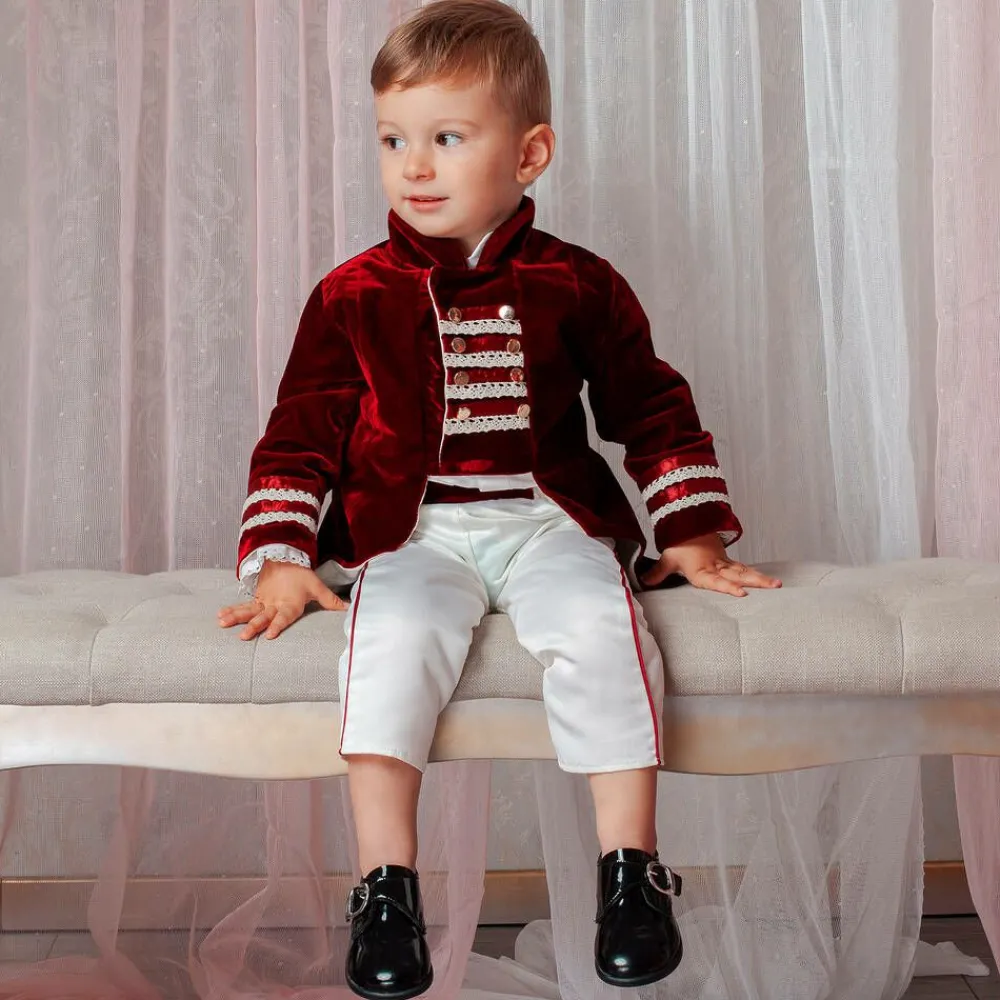 A charming special occasion suit for younger boys by Andreeatex, in dark red velvet and white satin. The velvet military-style tailcoat jacket fastens with internal buttons, has satin ribbon and lace trims, and decorative gold buttons. The white satin trousers have a piped trim and elasticated waistband and the lightweight cotton shirt has ruffled cuffs. A matching velvet and satin hat completes the outfit.