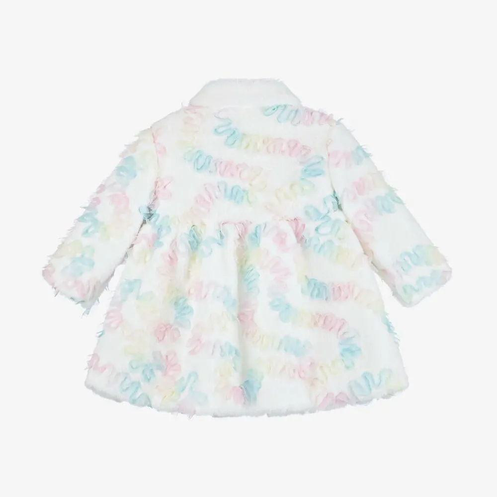 Beautifully soft, off-white coat for baby girls by British brand Angel's Face, made in mid-weight faux fur patterned with pastel tulle ribbons. The designer's signature grosgrain bows embellish the front and there is a sumptuous, off-white satin lining. The coat fastens with concealed poppers on the front.
