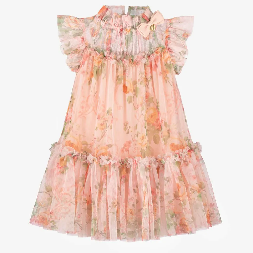 Beautiful pale coral pink floral print dress for girls by Angel's Face, with the brand's signature heart charm and bow detail on the neckline. It is made in layers of soft, fine tulle with delicate ruffles and a gently flared silhouette. Comfortably lined in soft jersey, the dress fastens at the back with a stylish keyhole button.