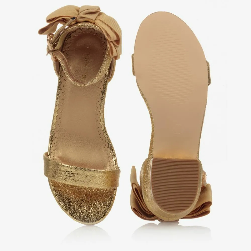 Girls gold special occasion sandals by Angel's Face, with a grosgrain ribbon bow on the back. They are made in metallic faux leather, and fasten with a gold and diamante heart-shaped buckle. The outer sole is in non-slip rubber and they have a 3cm heel for a touch of elegance.