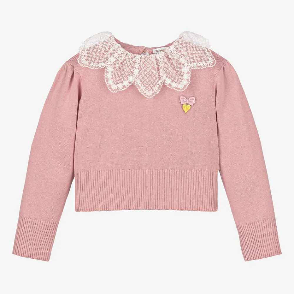 A softly knitted, rose pink cotton sweater for girls by Angel's Face. It features a beautiful floral lace white collar and pretty puffed sleeves. Fastening with a single heart button on the back, it has the brand's signature grosgrain bow and golden heart charm on the chest.