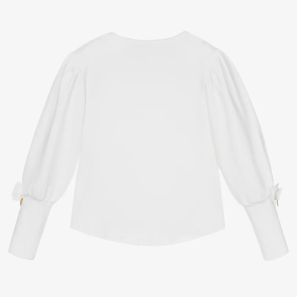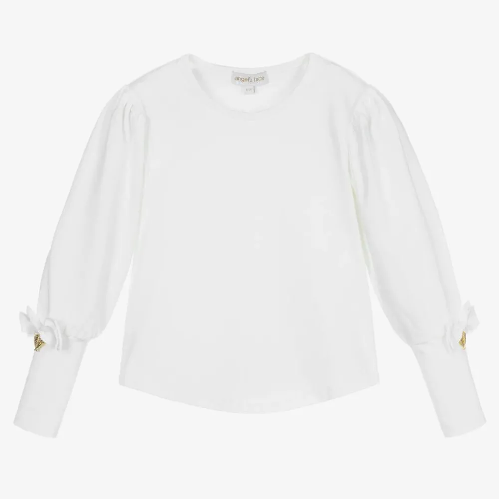 Pretty off-white top for girls by British brand Angel's Face. It has eye-catching sleeves that are gathered and full around the top, with the designer's signature golden heart charm and bow above the deep cuffs. It is made in comfortable cotton jersey with a curved hemline.