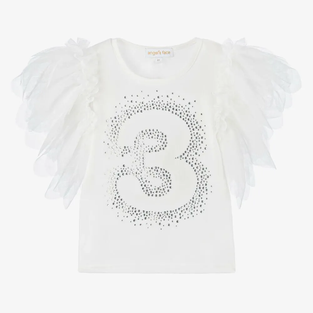 White T-shirt for little girls by British brand Angel's Face, made in soft and stretchy cotton jersey. In celebration of your little one's third birthday, there is a number 3 on the front outlined in sparkly diamantés. For an added touch of glamour, it has pretty, petal-shaped, tulle short sleeves with a ruffle trim.