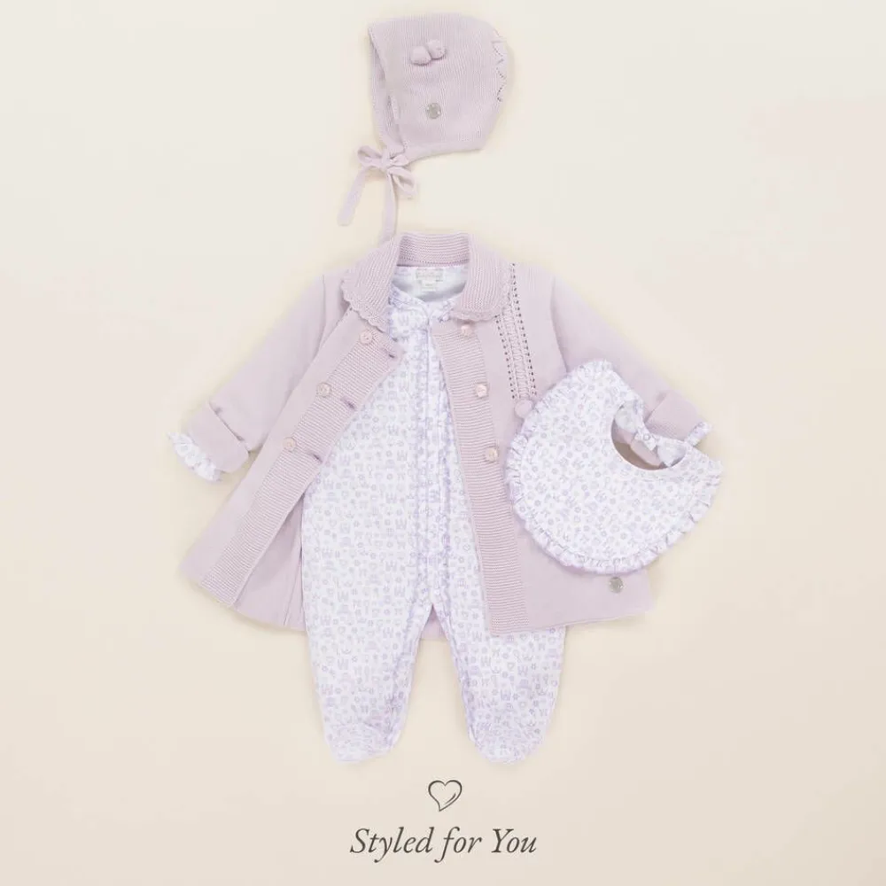 Knitted lilac purple coat and hat set for baby girls by Artesanía Granlei. The traditionally-styled coat has a rounded collar, pointelle trims and cute pom-pom decorations. It fastens with double-breasted buttons on the front a classic look, and is accessorised with an adorable, tie-fastening bonnet.