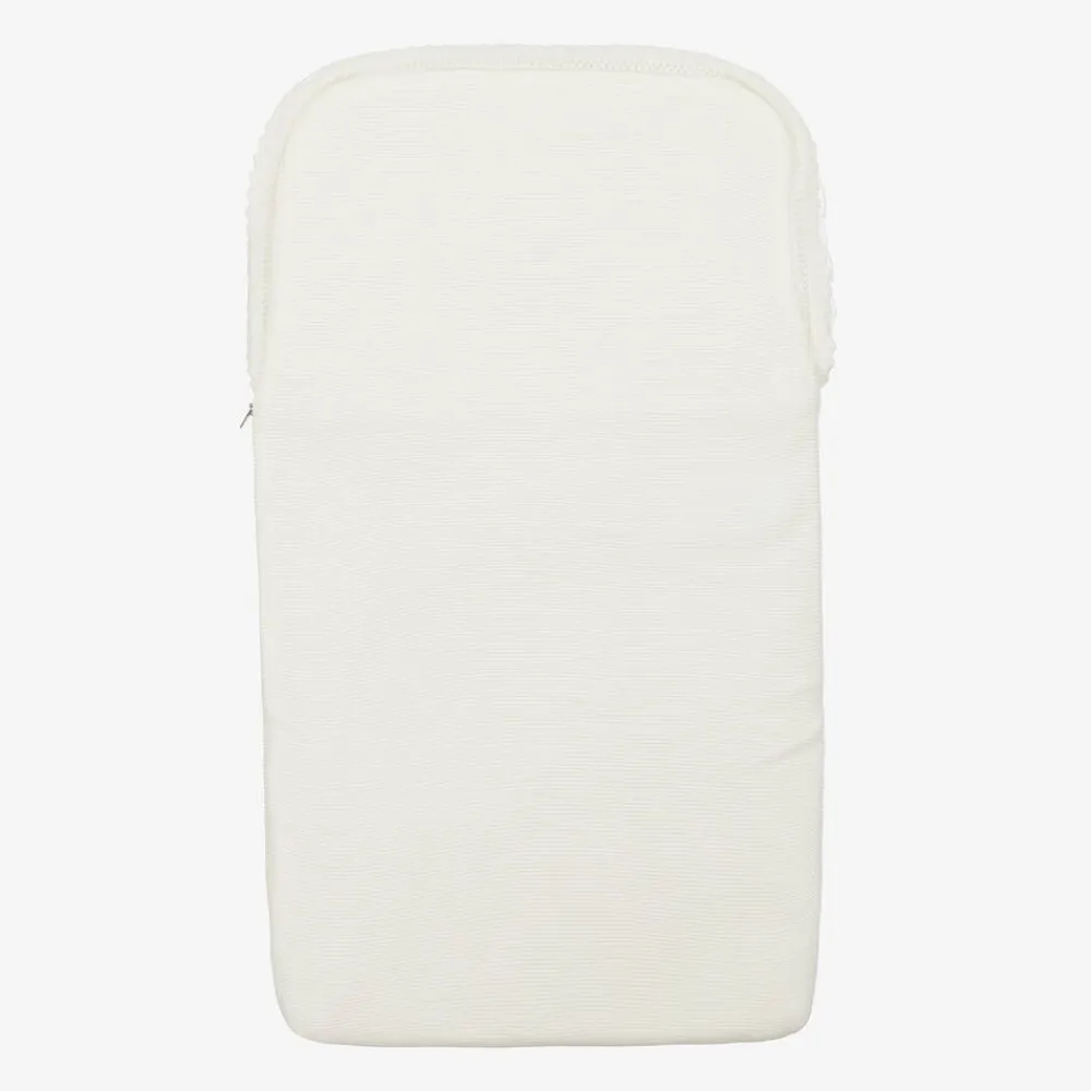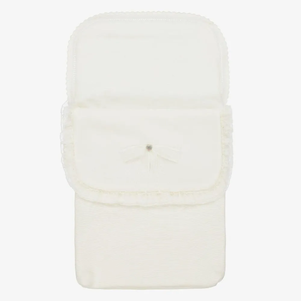 A knitted baby nest for girls by Artesanía Granlei, in a neutral shade of ivory. Comforting for baby, this padded nest has a fold-down front with a delicate lace trim. This matches the decorative bow, accompanied by the brand's signature mother-of-pearl logo charm. A side zip fastening helps to get little ones in and out with ease.