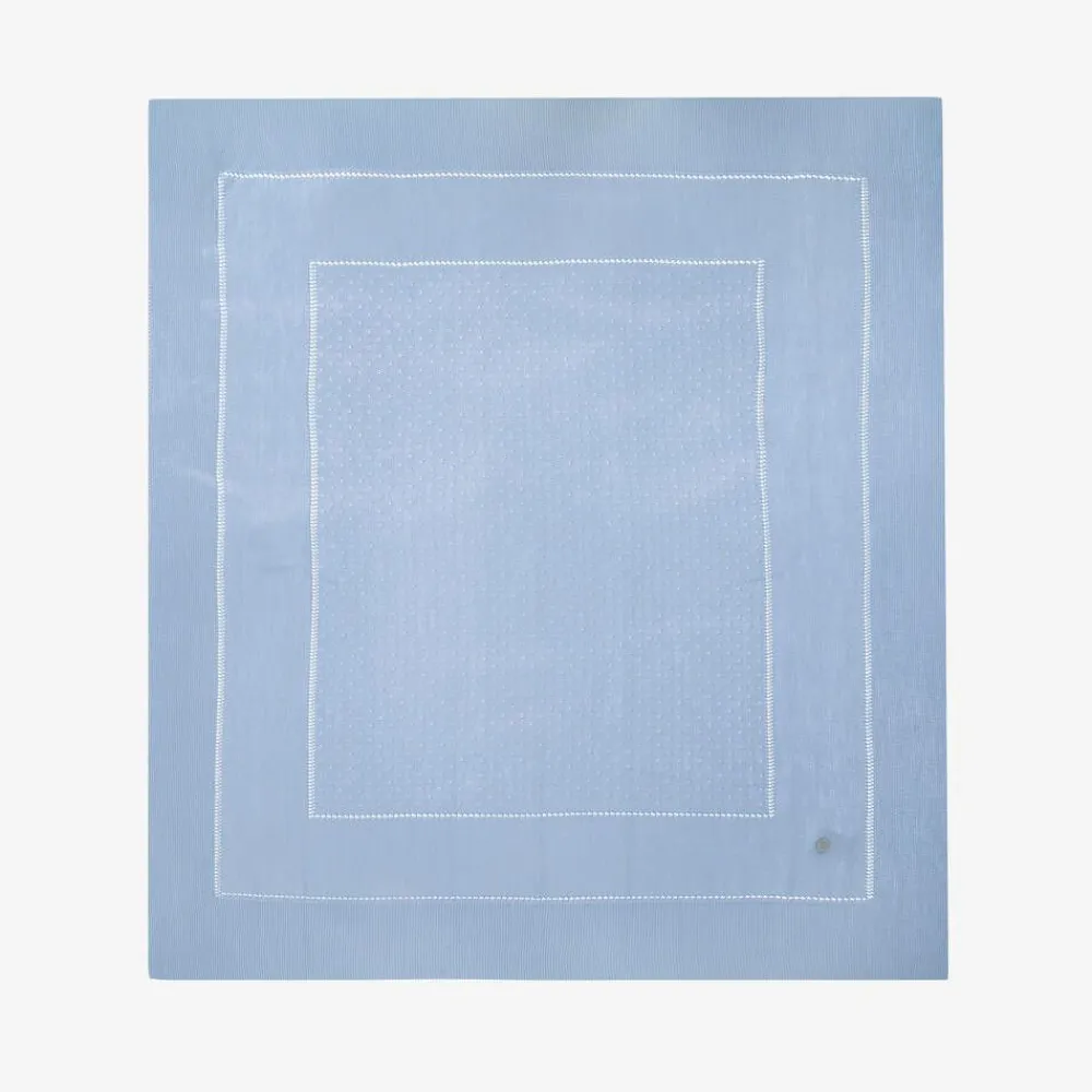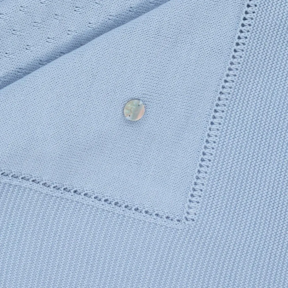 Pretty pale blue blanket for baby boys and girls by Spanish brand Artesania Granlei, knitted in different patterns to give a contrasting centre and border. Made in a soft, lightweight knit, it has an iridescent mother-of-pearl logo charm sewn in one corner. The blanket is ideal for use in the nursery, or for when out and about in the pram or car seat.