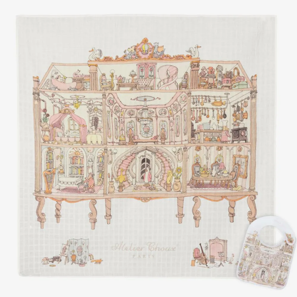 A beautiful, ivory swaddle and bib set for baby girls by luxury French brand Atelier Choux Paris, made in lightweight, organic cotton. Ideal for use as a tummy time blanket, changing surface, or for privacy while breastfeeding, the swaddle is beautifully illustrated with a large, detailed dollhouse with the signature brand name just below. The matching, double-sided bib has easy-to-use, adjustable popper fastenings for a great fit. Both pieces are presented in a beautiful gift box.