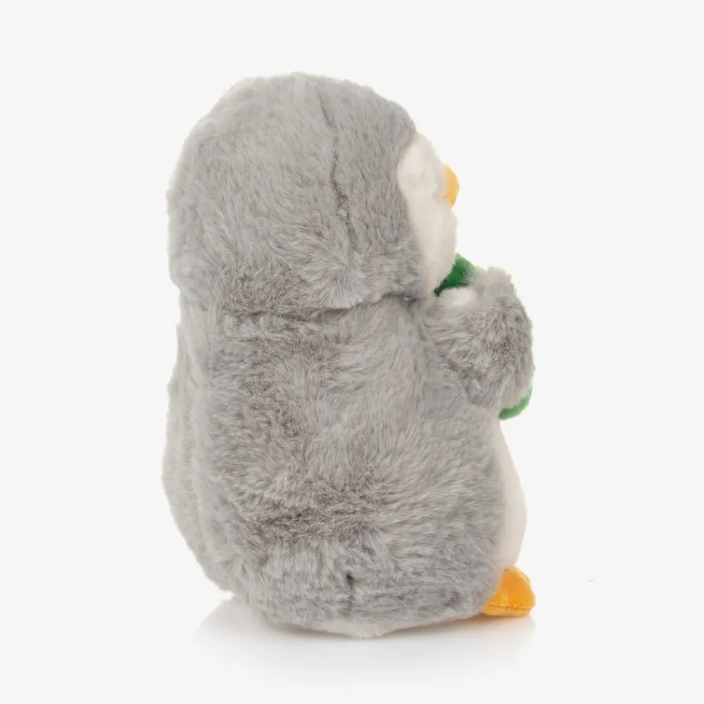 Adorable grey and white PomPom Penguin soft toy for boys and girls by Aurora, holding a green Christmas tree. Part of the brand's PomPom Penguins collection, it is handmade in beautifully soft plush and padded with recycled fibre and pellets. Spreading festive cheer, this cute and cuddly collectable has friendly beaded eyes and a sweet yellow nose and feet.