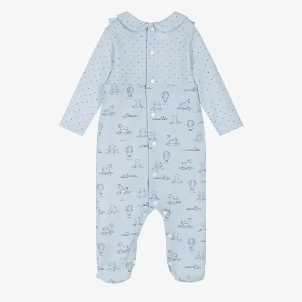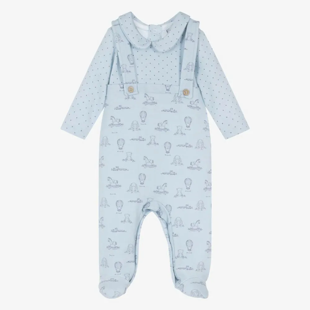 Sweet blue babygrow for boys by Spanish brand Babidu, made in soft cotton jersey. Designed to look like a two-piece set with shoulder straps, the top has a grey dot print and a rounded collar. The bottom has a cute grey nursery toy print featuring bunnies, teddy bears and rocking horses. There are faux wooden button trims on the front and popper fastenings on the back and between the legs.