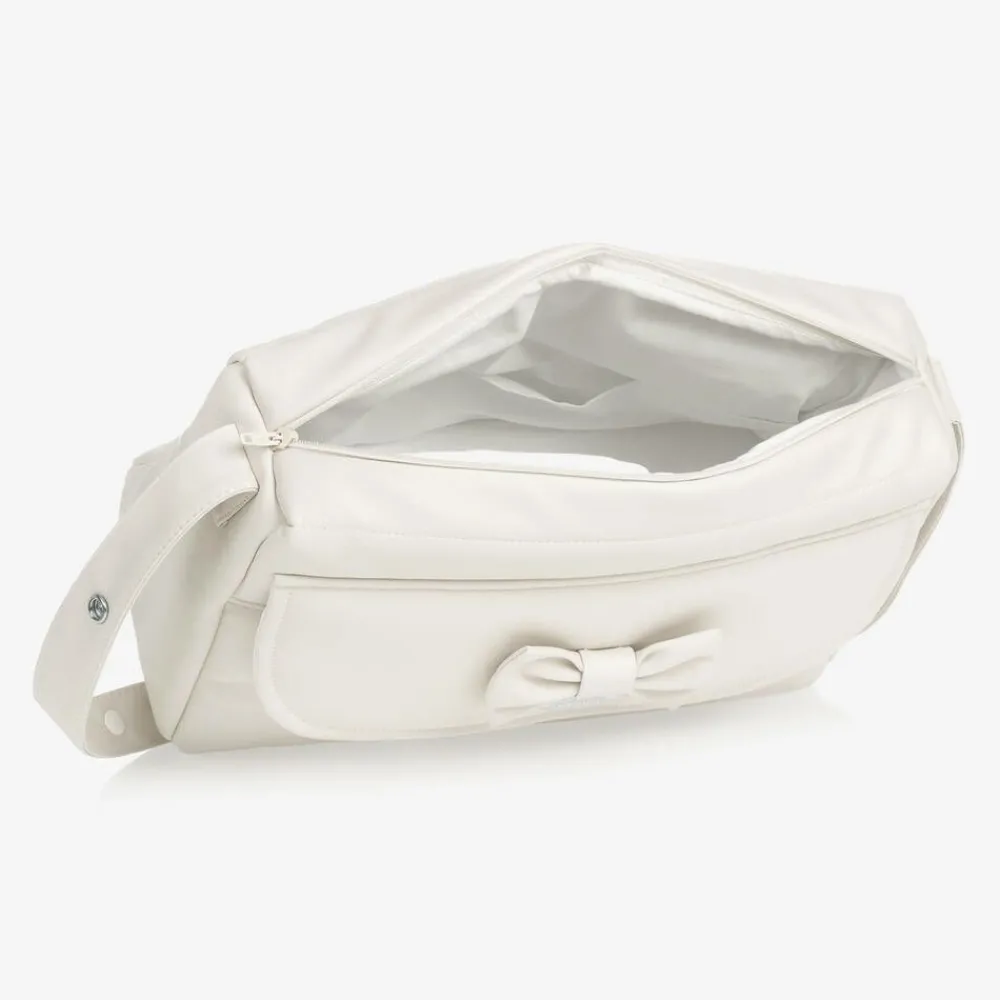 Ivory baby changing bag by Babidu, made from very soft and lightly padded faux leather. Lined in a lightweight polycotton, the main compartment has useful pockets and elasticated bottle holders. The exterior flap pocket has a pretty bow and logo branding. The strap has popper fastenings so it can be attached the buggy handles.