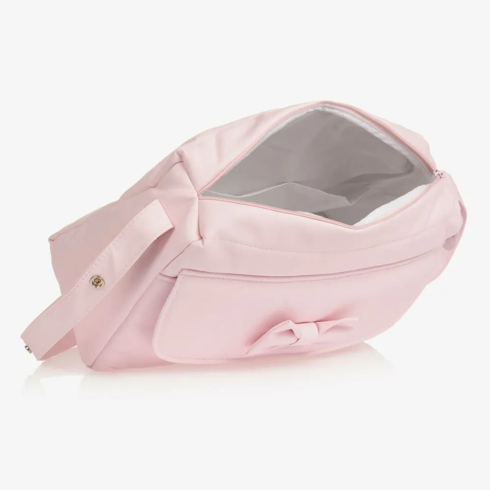 Pink baby changing bag by Babidu, made from soft and lightly padded faux leather. Lined in a lightweight polycotton, the main compartment has useful pockets and elasticated bottle holders. The exterior flap pocket has a pretty bow and logo branding. The strap has popper fastenings so it can be attached the buggy handles.