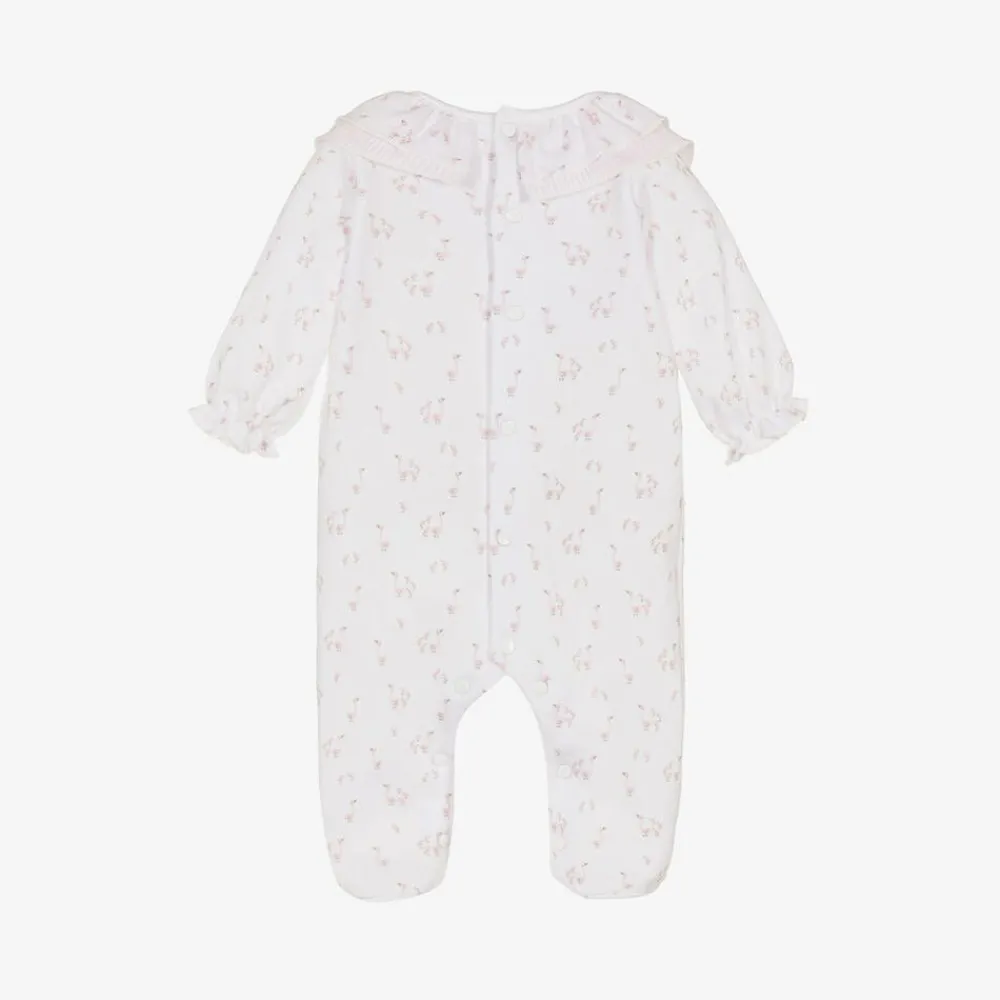 White babygrow for girls by Spanish brand Babidu, made in soft cotton jersey. Comfortable against delicate skin, it is patterned with cute pink ducks and has a ruffle collar layered with a delicate pink and white striped trim. There are matching striped trims on the feet and popper fastenings on the front and between the legs.