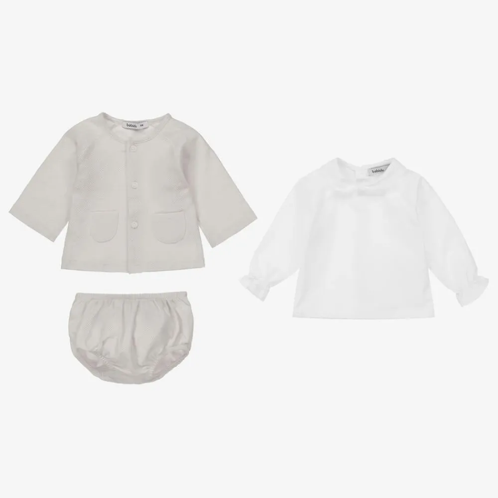 Grey and white shorts set for little boys and girls by Babidu. The grey shorts and cardigan are made in soft cotton jersey, with a fine honeycomb texture and there are pockets on the cardigan. The white shirt is made in lightweight cotton with elasticated cuffs and a rounded collar.