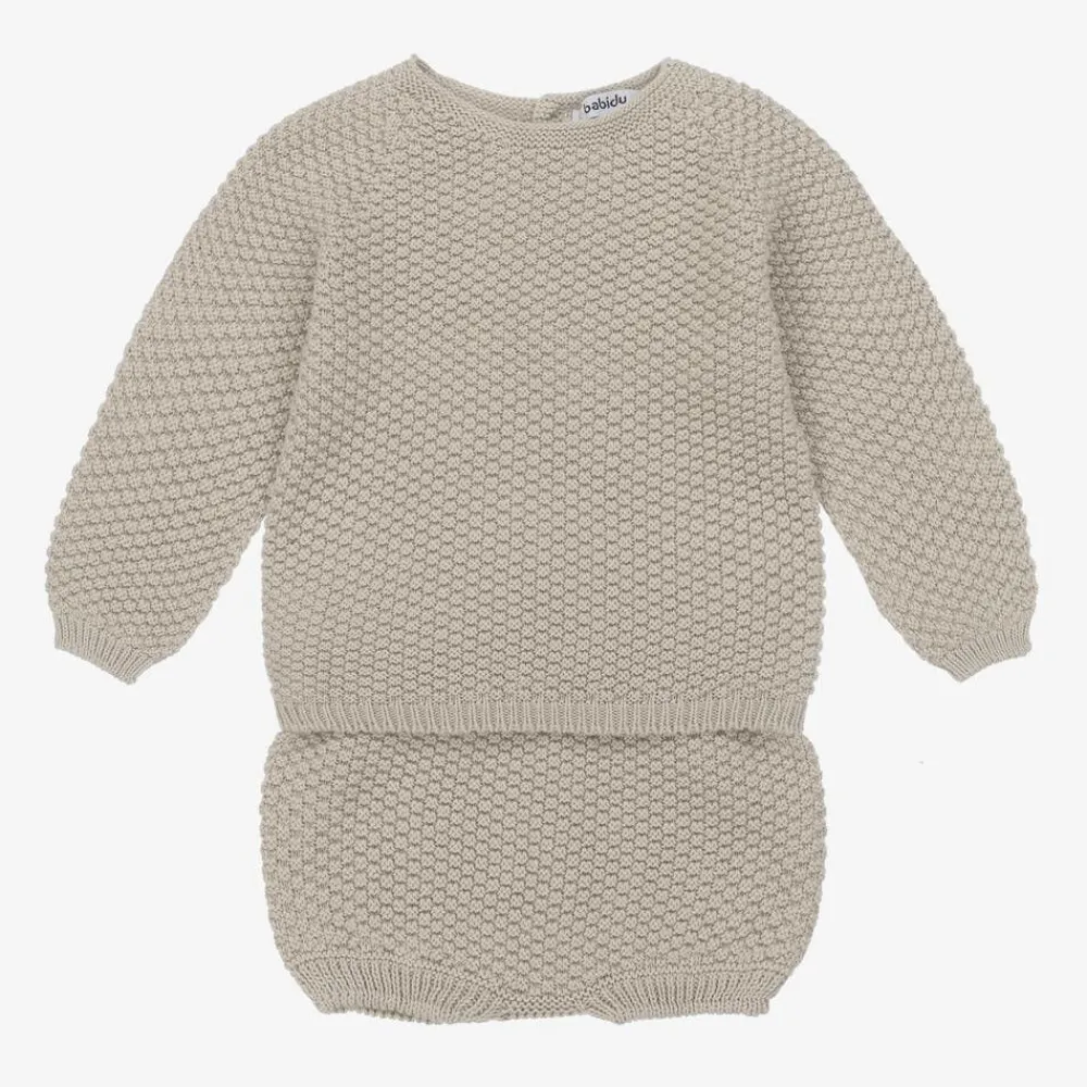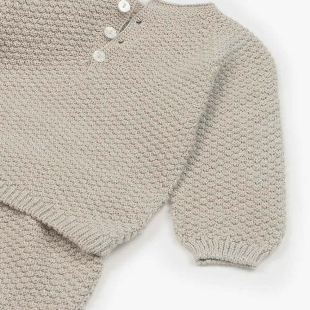 Sweet beige cotton shorts set for little boys by Spanish brand Babidu. Soft and comfortable to wear, it is knitted in a pretty, textured moss stitch and has neat, ribbed trims. The sweater fastens on the back with little white buttons, and the shorts are easy to wear, simply pulling up.