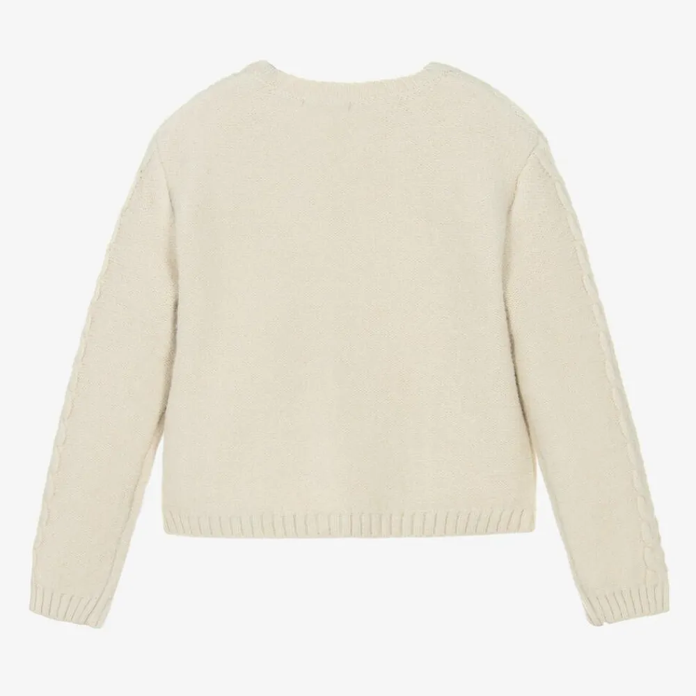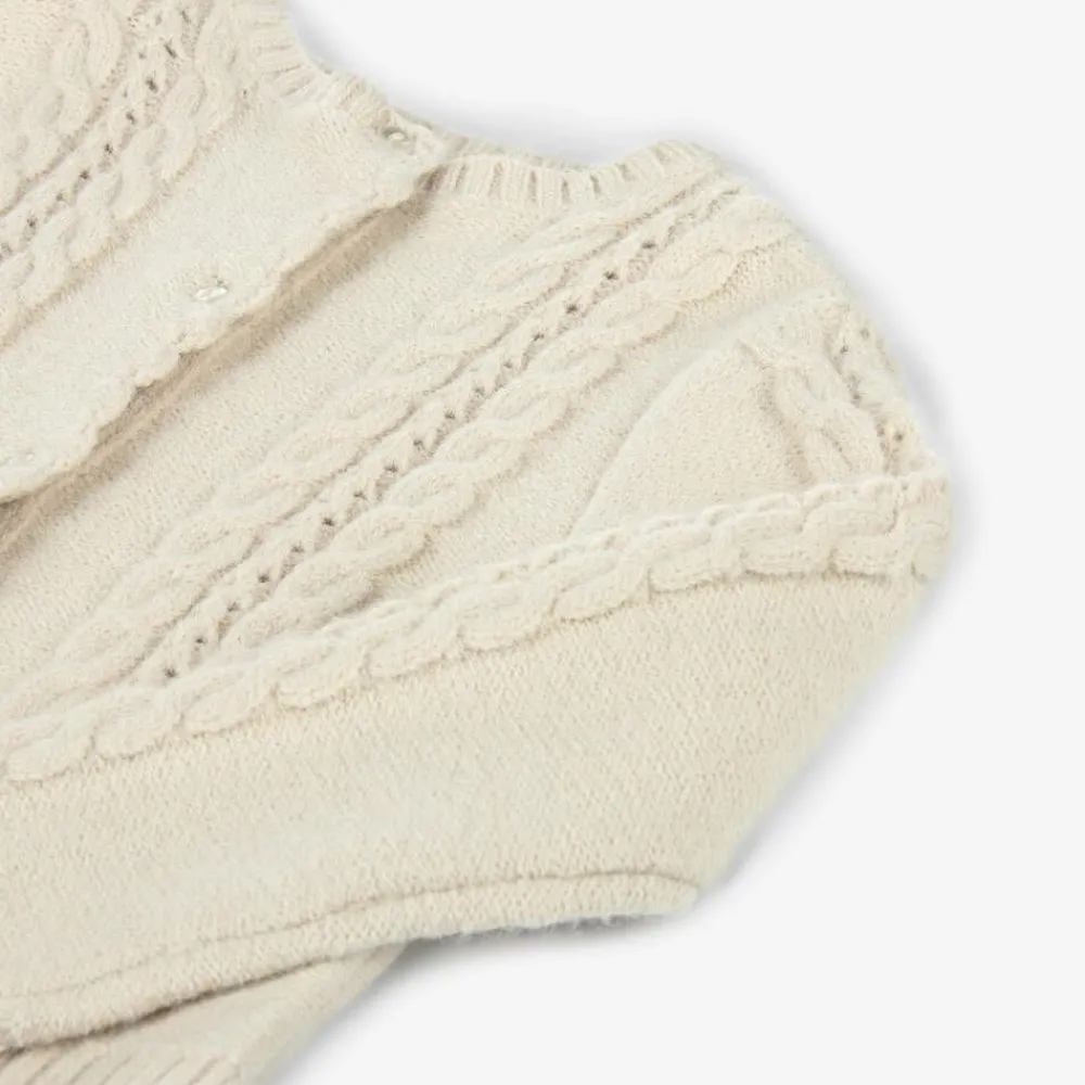 A charming beige cardigan for boys and girls by Babidu. Knitted with a touch of wool for cosy comfort, this classic layering piece has cable knit details and beautiful openwork designs. It fastens with neat buttons on the scalloped placket.
