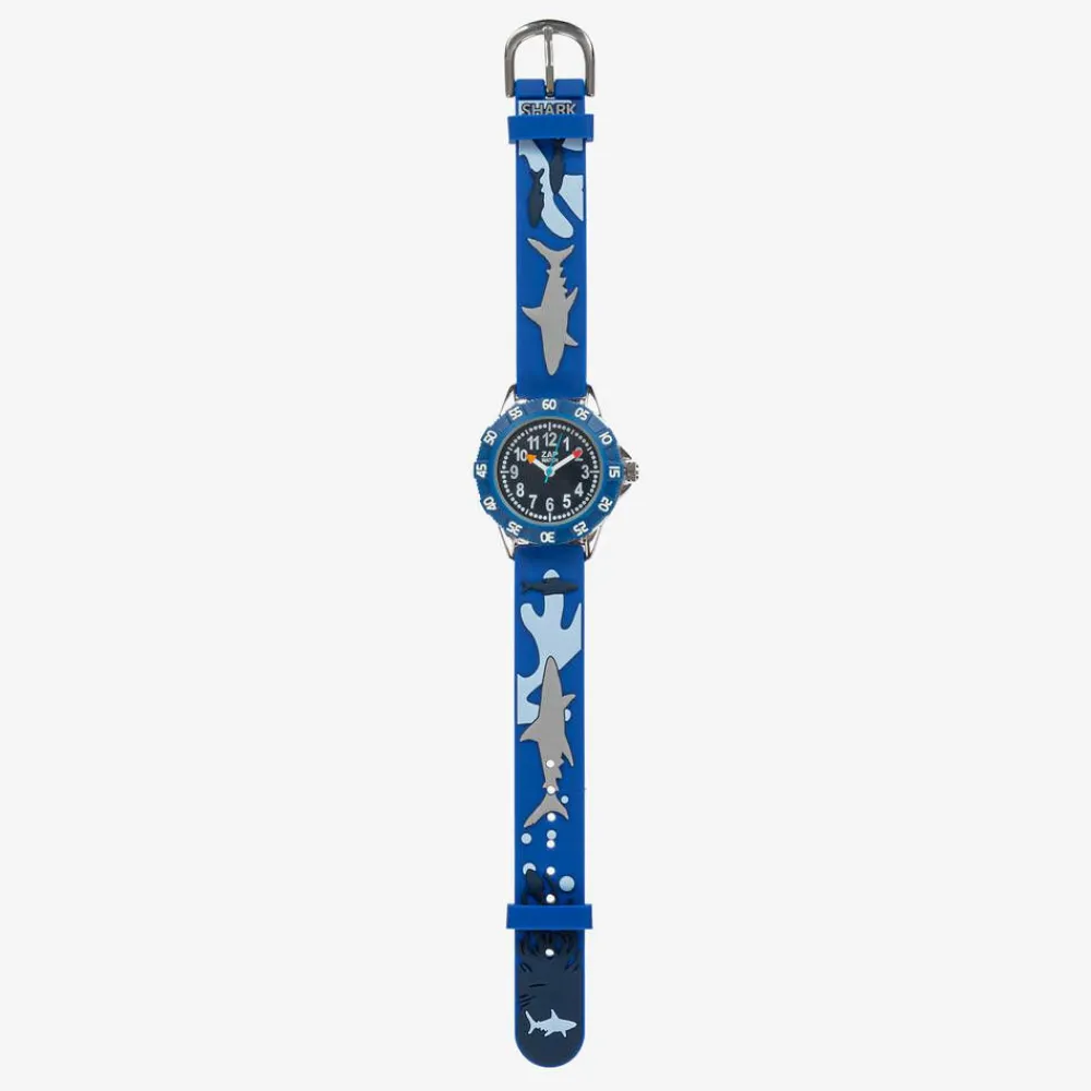Royal blue rubber watch for boys by French brand Baby Watch, Paris. Helping to make learning to tell the time fun, it includes a cardboard clock and an illustrated, teaching booklet. The flexible, adjustable blue strap is decorated with sharks in blue and grey and fastens on the wrist with a nickel-free metal buckle.