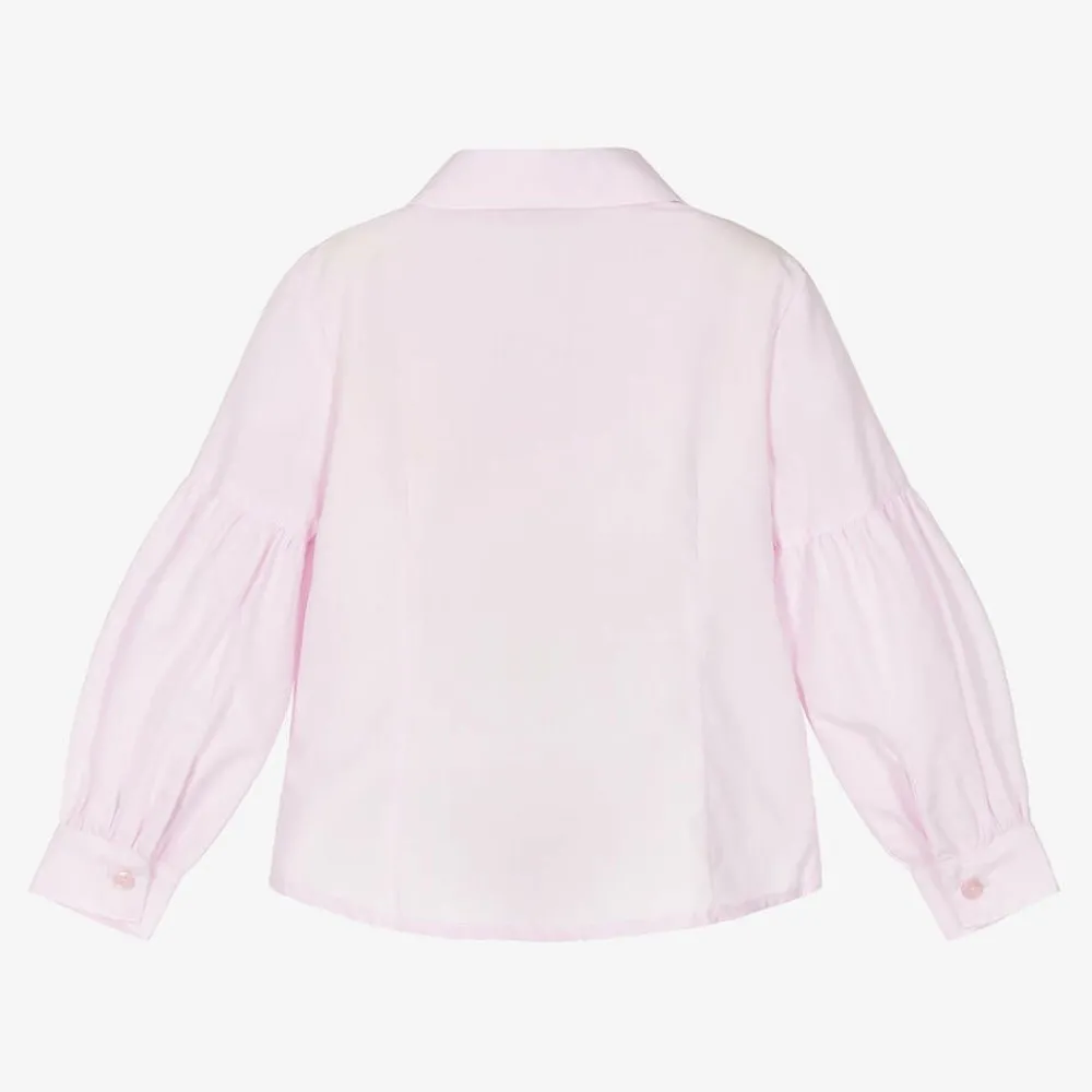 A smart pink blouse for girls by Balloon Chic, made in a lightweight cotton blend. Button fastening, it has a large, stylish bow appliqué at the neck and pretty puffed sleeves with buttoned cuffs.