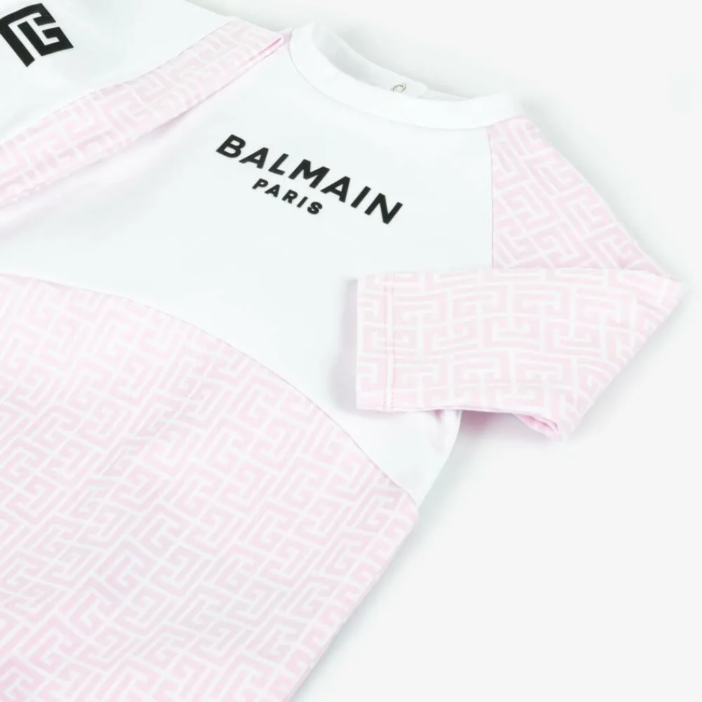 Stylish white and pale pink cotton babygrow gift set for girls by luxury French designer Balmain, made in soft, comfortable jersey. The babygrow has a bold black, rubberised logo on the bodice and is patterned with the unmistakable Balmain monogram logo in pale pink. It fastens with poppers on the back and between the legs. The coordinating, double-layered hat has a rubberised black monogram logo on the front and a pink monogram-patterned brim.