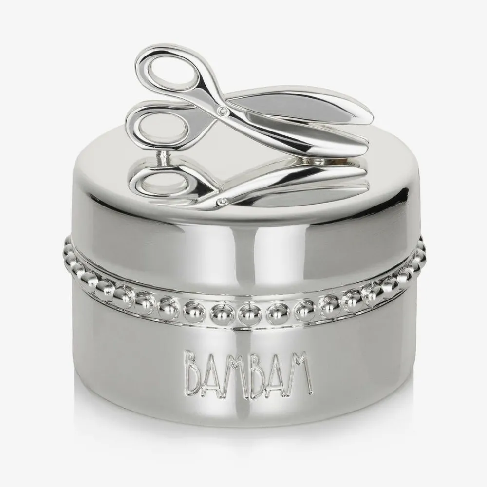 A silver plated hairlock keepsake box by Bam Bam. Decorated with a dainty pair of scissors on top and scripted with 'first hairlock' on the side, this beautiful item will help you treasure those precious first memories of baby. It is presented in a lovely branded box.