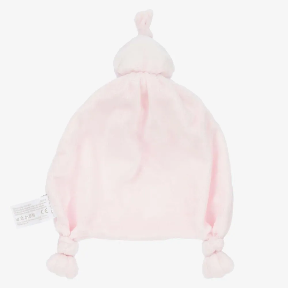Adorable pale pink doudou for baby girls by Bam Bam, made from super soft plush fleece. It has a softly padded duck head at the top, with knotted corners at the bottom, perfect for little hands to grip. On the front is an address label that can be filled in with a name and number, just in case the precious comforter gets lost.