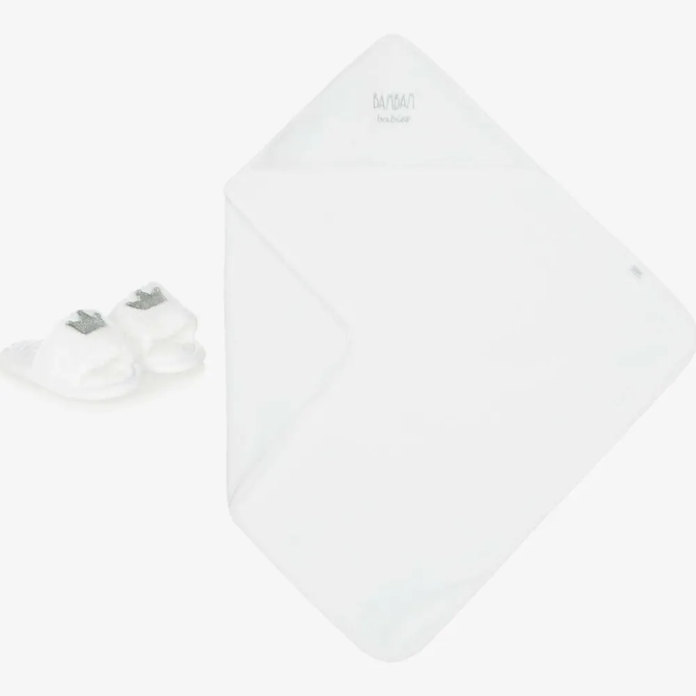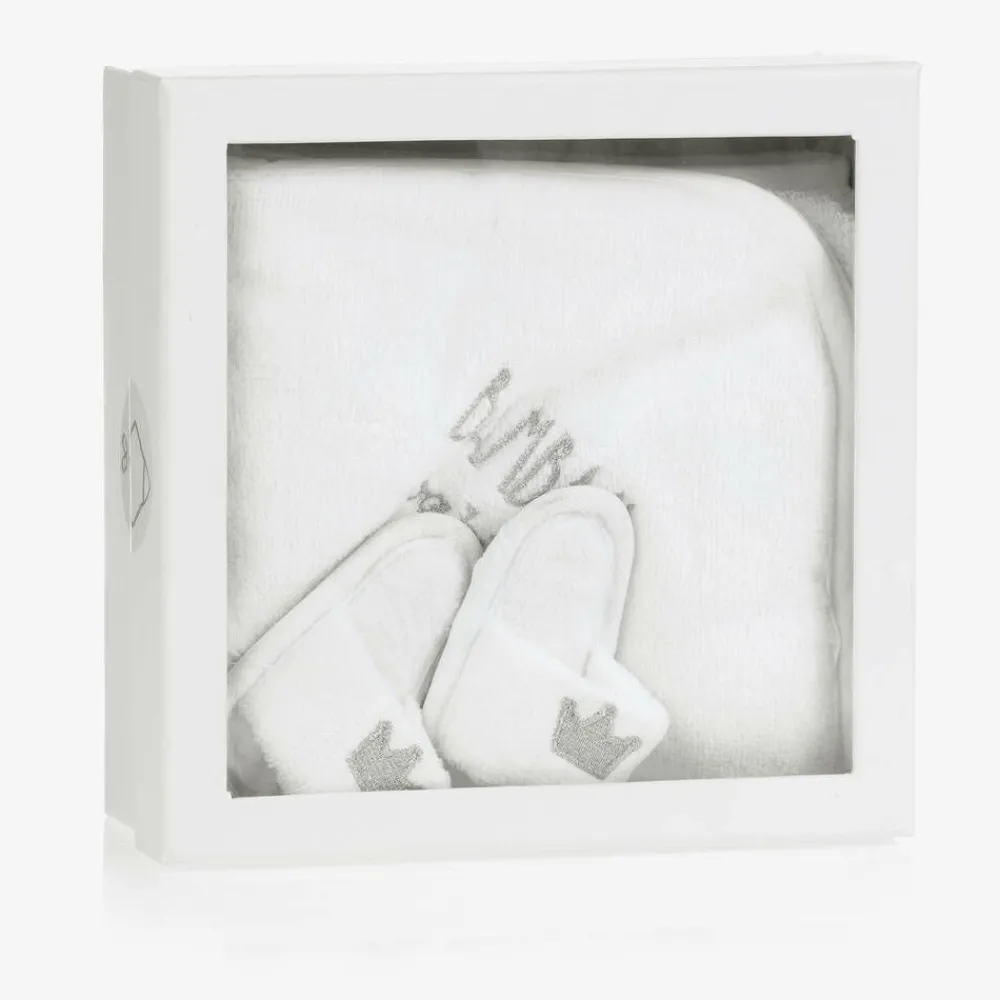 Pale ivory hooded towel and slippers set for baby boys and girls by Bam Bam. The towel is made in beautifully soft and absorbent terry cotton, with silver logo embroidery on the hood. The cute matching slippers are in a slider style and have silver embroidered crowns on the front. Coming in a gift box, this sweet set makes an ideal present for a new arrival.