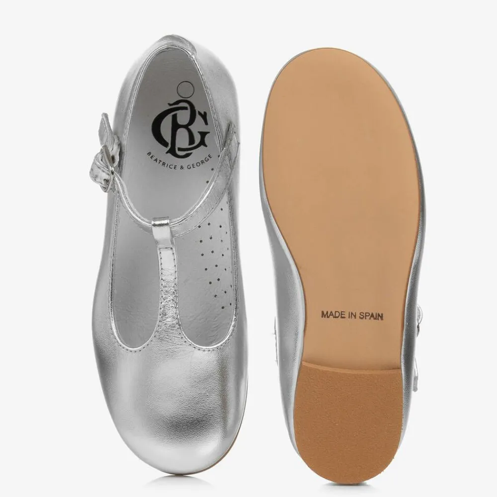 Silver T-bar shoes for girls by traditional British brand Beatrice & George, exclusive to Childrensalon. Made in soft, supple leather, they have a cushioned footbed for comfort and a super soft leather lining. They fasten with a silver buckle and have a faux leather outer sole.